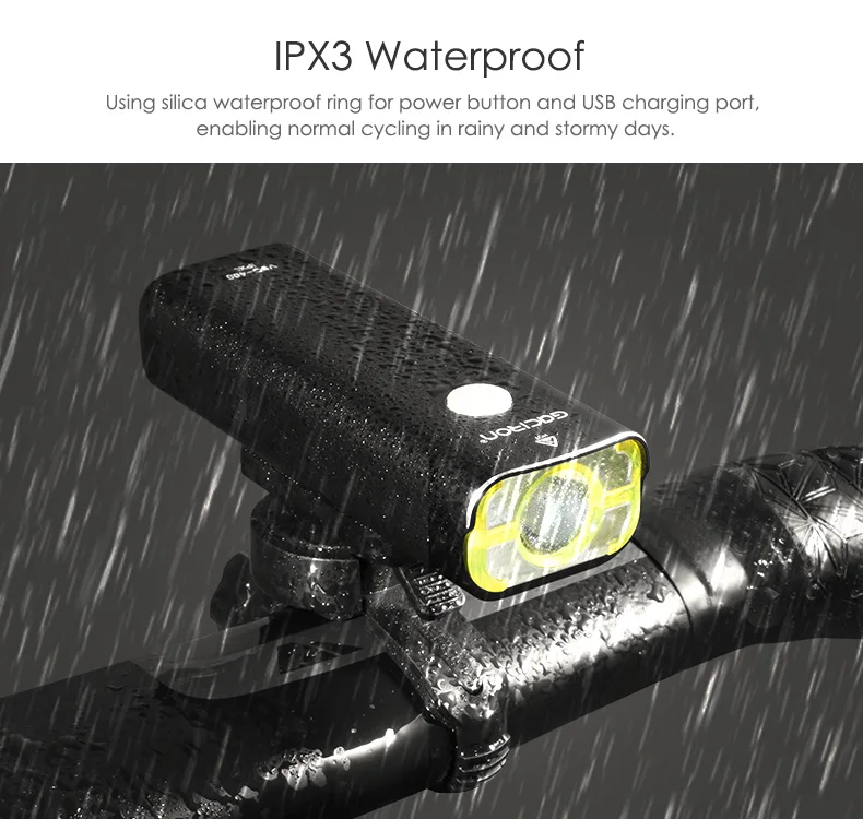 * Водонепроницаемость IPX3: использование силиконового водонепроницаемого кольца для кнопки питания и usb-порта для зарядки, что обеспечивает нормальную езду на велосипеде в дождливые и бурные дни.