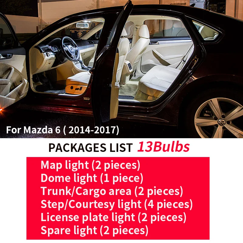 This listing is a White 13pcs Interior Package Kit For 2014- 2017 Mazda 6 Our LED lights are made of brighter premium 5630 SMD chips which have longer lifespan compared to others.