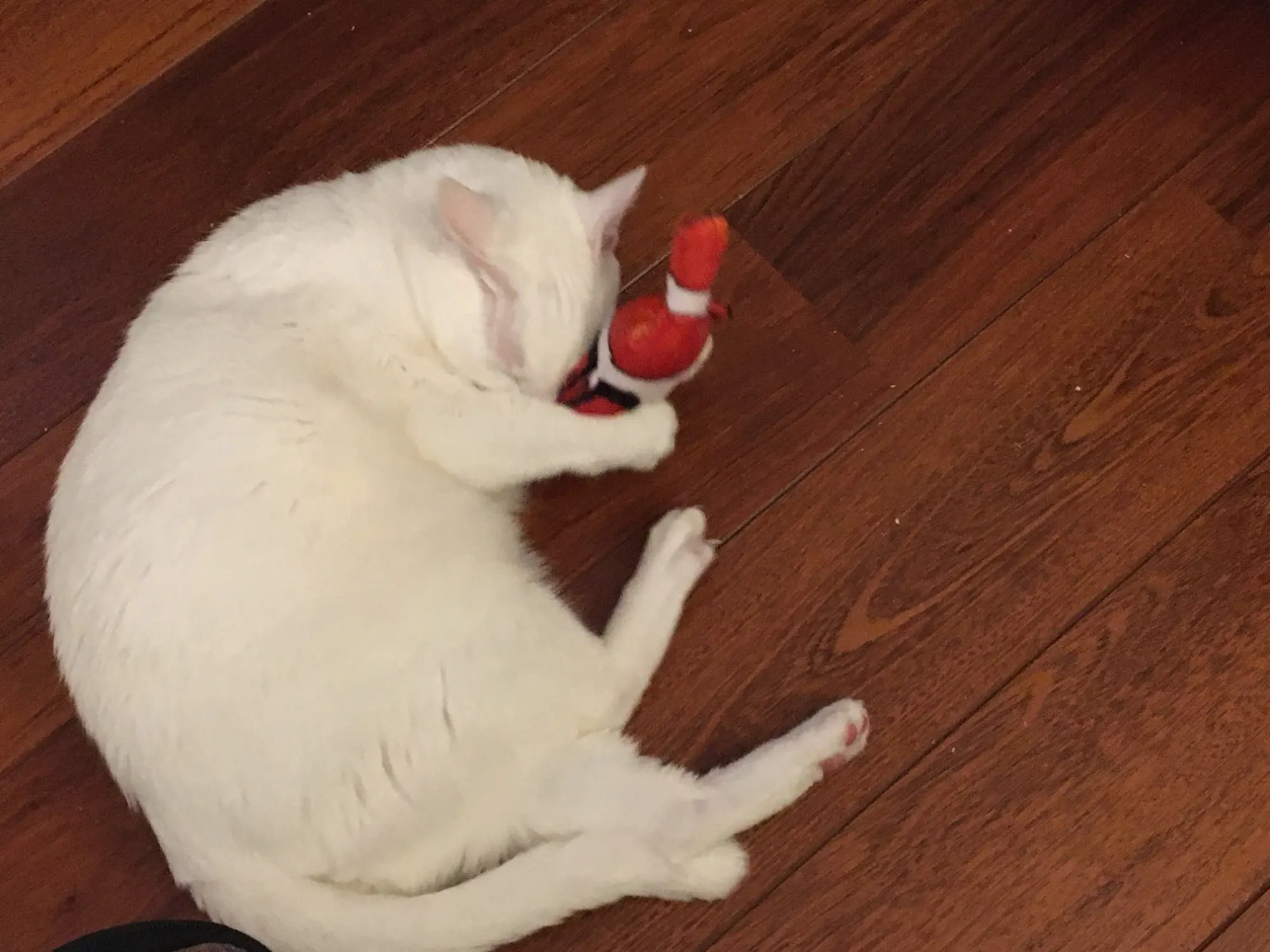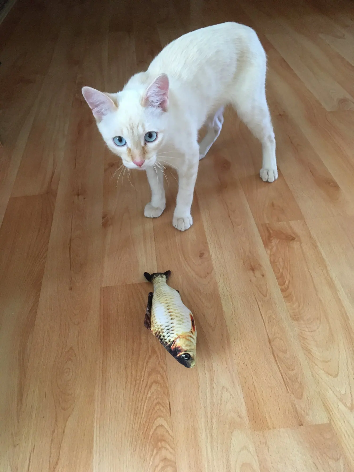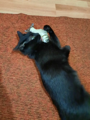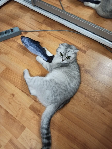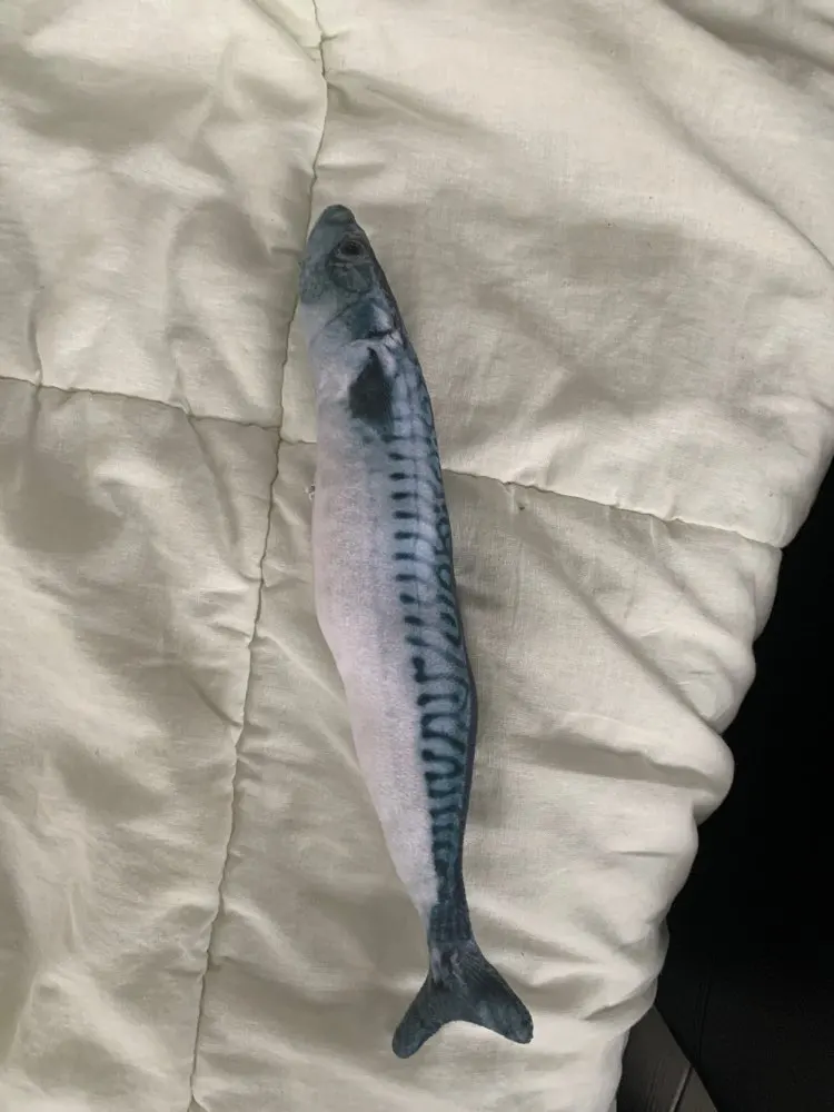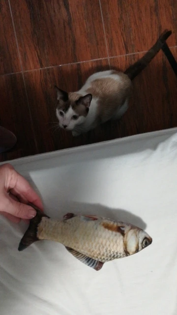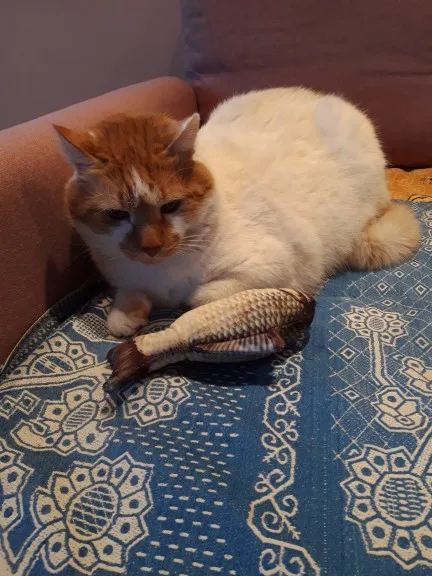 Это не первая рыба моего кота. Он как всегда как с ума сходит с ней. Играет. Красивая рыбка. Пришло быстро, размер самое то.