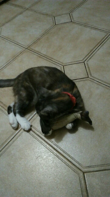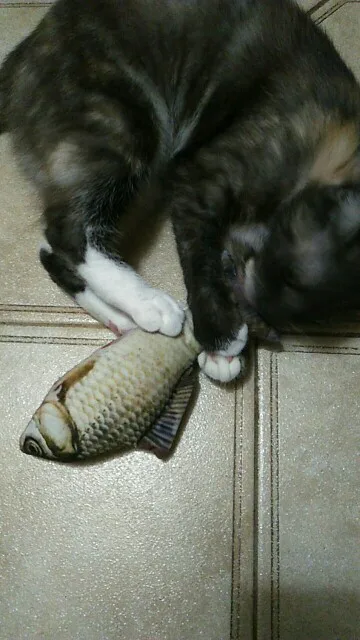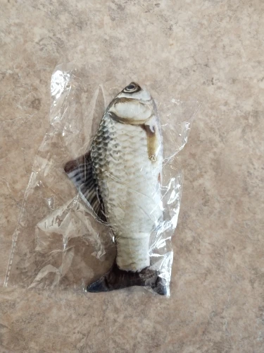 Карась пришел в целости и сохранности вместе с другими игрушками. Коту Марсику понравилось. ;)
