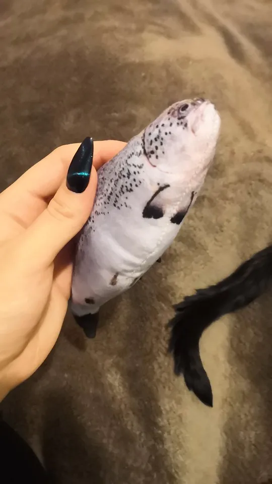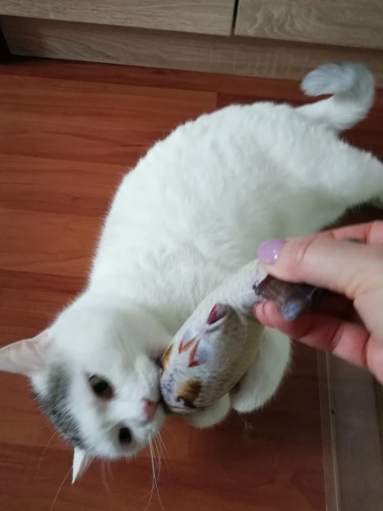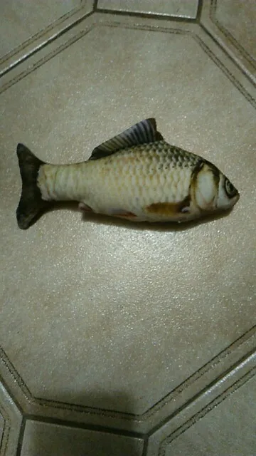 Игрушка классная. Кошка моя не игривая, мягкими игрушками никогда не играла, а эта рыба понравилась. Внутри мешочек с мятой. На ощупь приятная. Мешочек под молнией, можно менять. Доставка 2 недели в Украину. Брали 30 см. СПАСИБО!