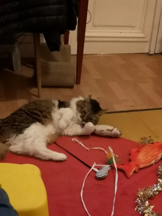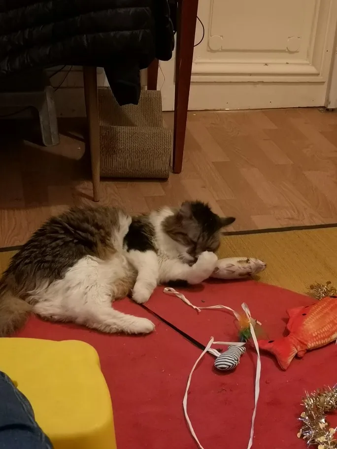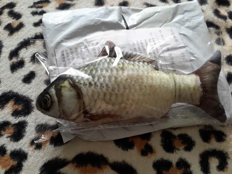 посылка шла ну ооочень долго, возможно из-за того, что на таможне долго разбирались что за травка внутри карася) но кот просто без ума от него, надеюсь за неделю не раздерёт)