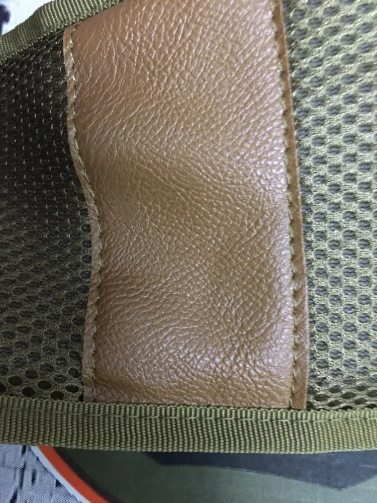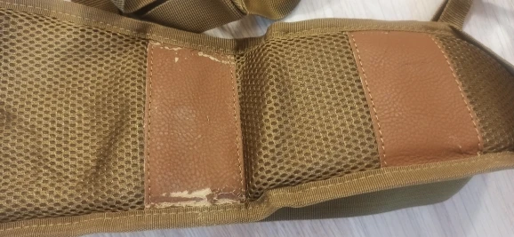 Сшито очень аккуратно. Только в одном месте строчка не прошита. Сзади на внутренней стороне ремня посередине нашито Velcro. С обратной стороны ремень обшит сетчатой тканью. В нескольких местах усиление искусственным материалом, внешне похожим на кожу. Лямки в комплекте. Центральная пряжка - очень большой фастекс.