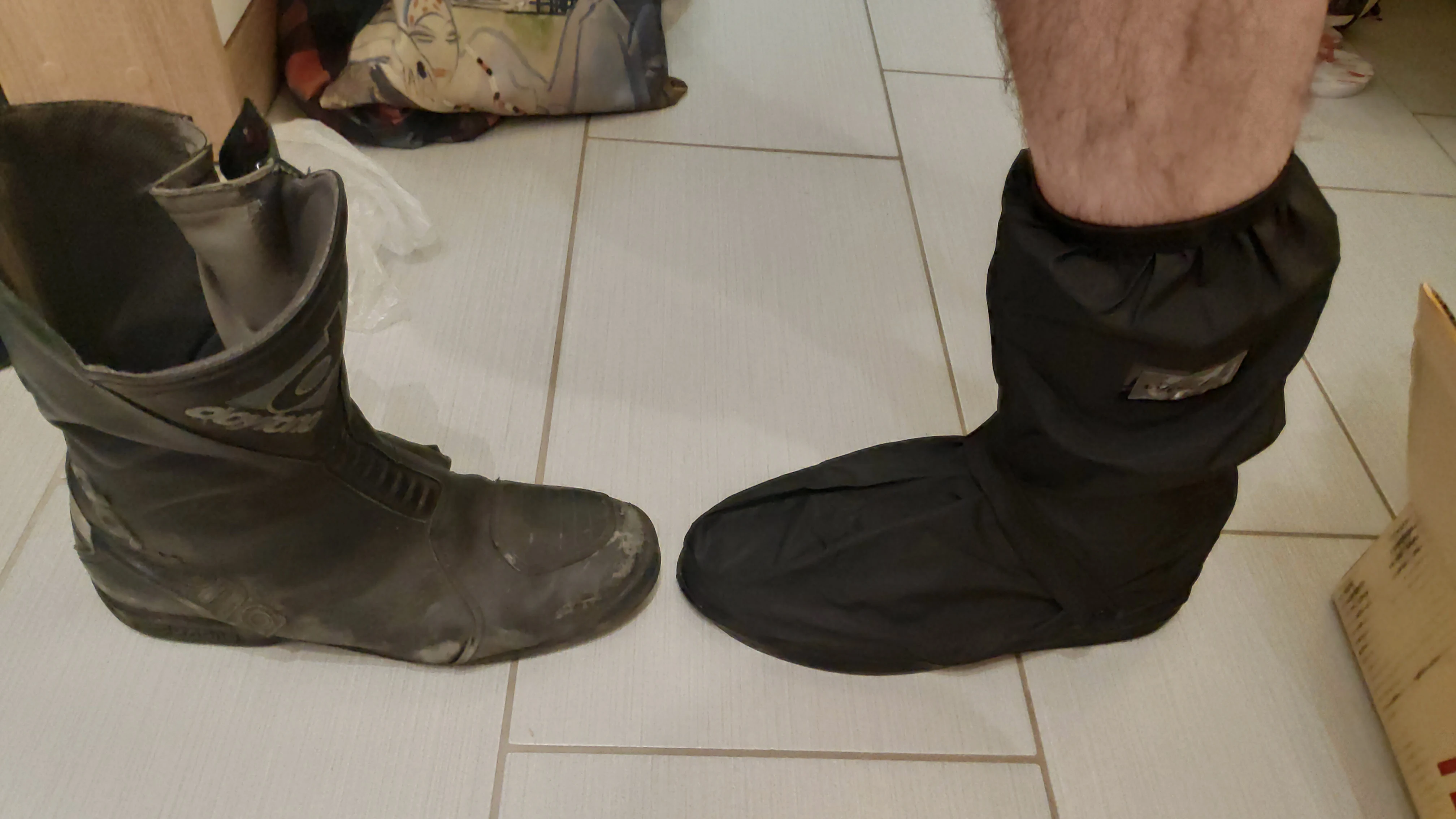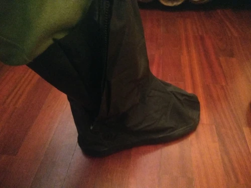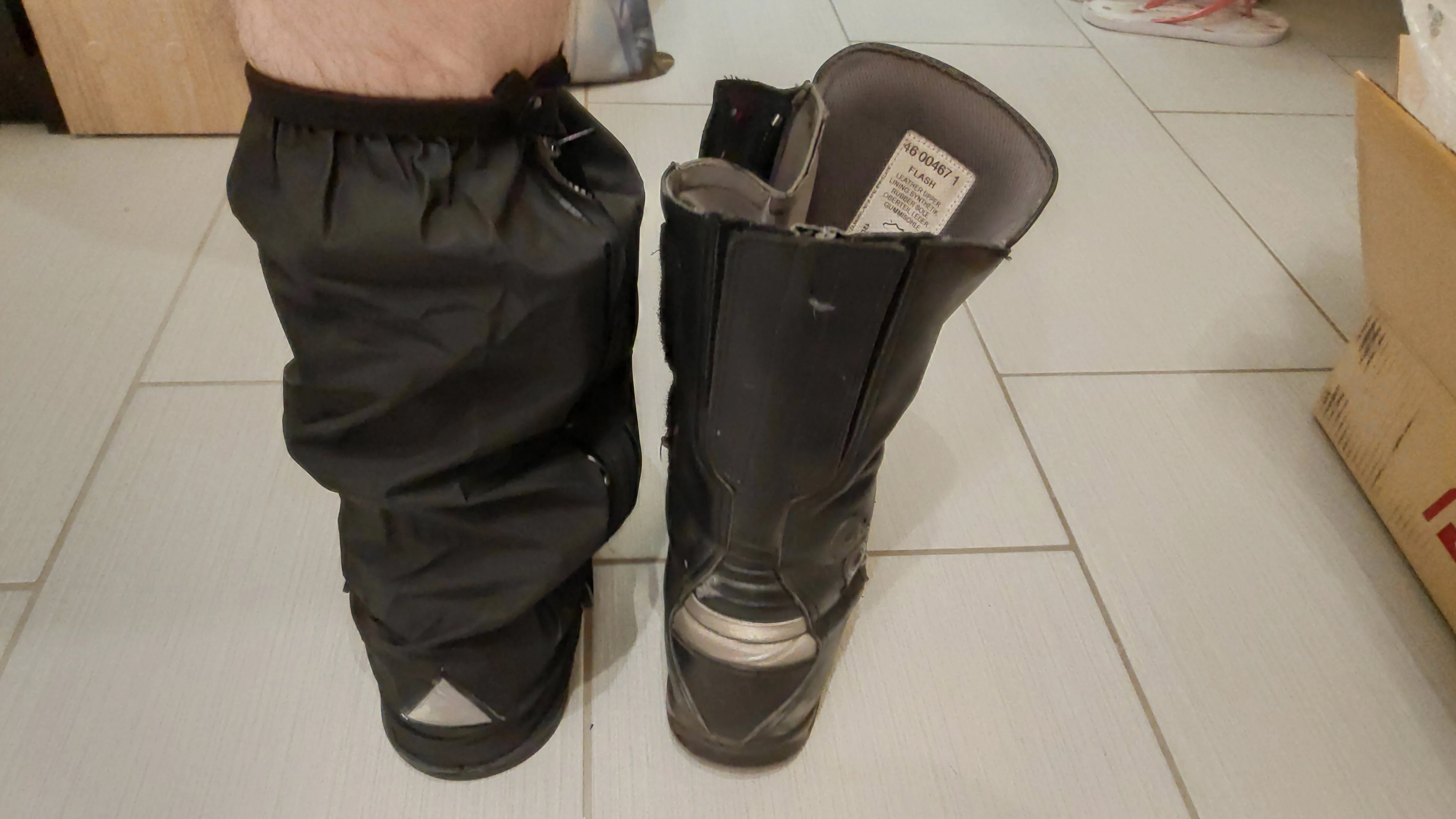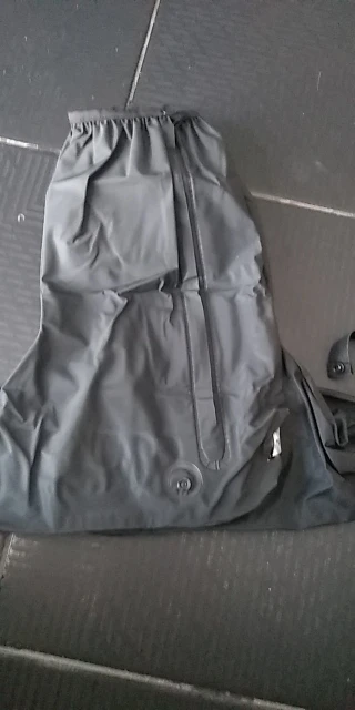 Выглядит хорошо, размер 46 идеально подходит только для мотоциклетных ботинок. Еще не пробовал в реальных влажных условиях снаружи. Ботинки остаются сухими после того, как положите их под душ в течение 30 или около того секунд. Резиновый ремешок является прекрасным дополнением.