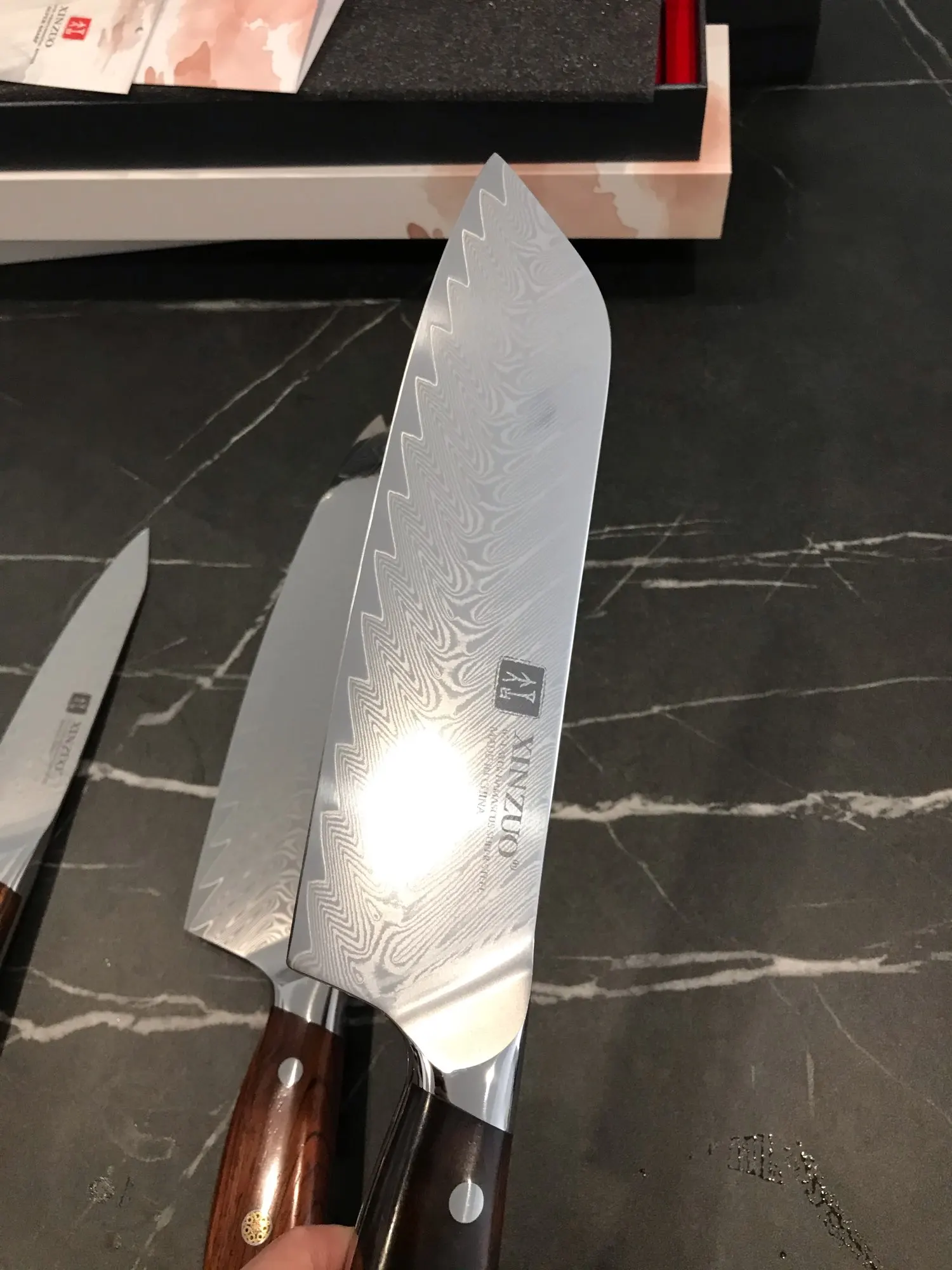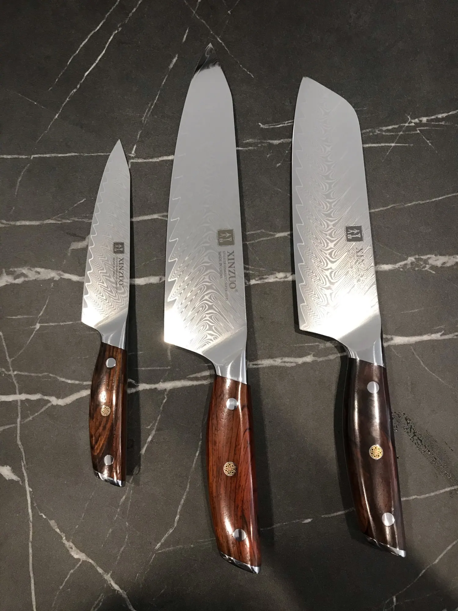 Отличные ножи. Быстрая доставка. Первый раз покупаю у этого продавца, но это второй раз покупая ножи марки Xinzuo. У меня есть несколько различных брендов ножей от AliExpress, все перечисленные как VG10, 10Cr или Дамасская сталь и сталь на моих ножах Xinzuo, заметно лучше. Я не знаю, в чем разница, но с этими ножами я могу получить более острый край, и он держит его дольше, чем все мои другие китайские ножи. Ручки прочные и удобные в хранении. Форма лезвий на всех трех этих ножах Хорошо продуманная и очень практичная. Если вы ищете набор кухонных ножей, я настоятельно рекомендую их.