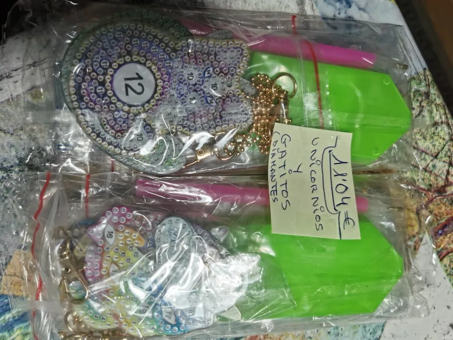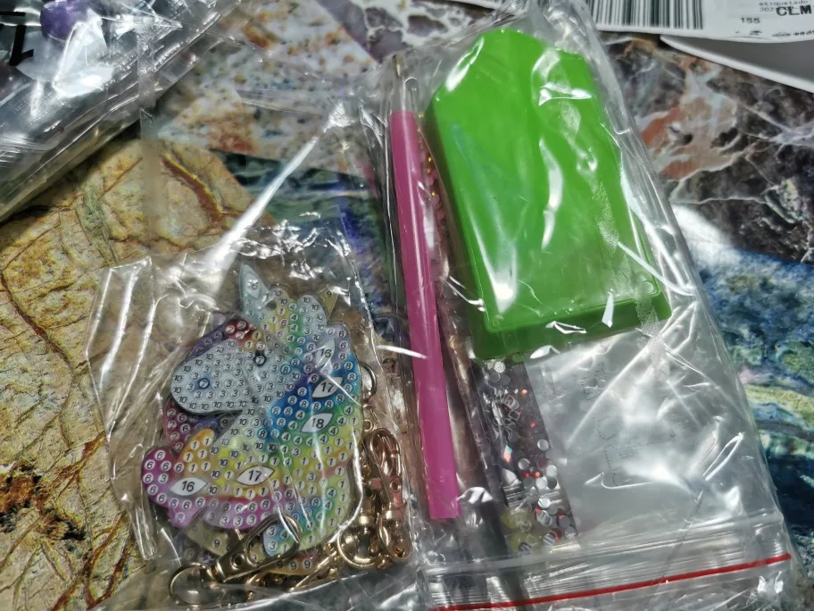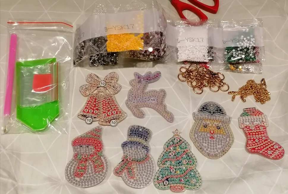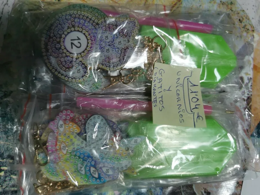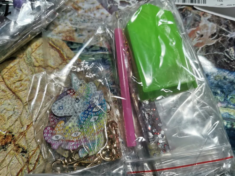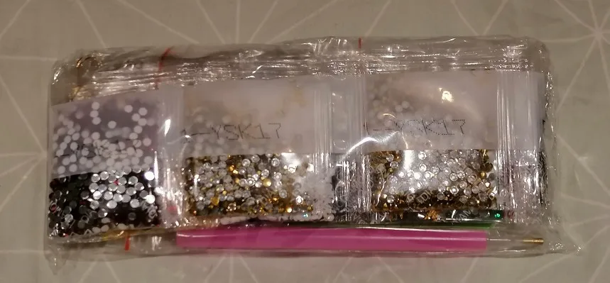 Быстрая доставка. В комплект входит: 10 картонных узоров + бриллианты + стилус + восковая квадрат + подвесные Шнуры + чашка, чтобы положить алмазы. Небольшой сюрприз: белый жемчуг перламутровый. Очень красивый. Я подумывал о том, чтобы подготовить праздники к концу года с моей дочерью 3 года и 8 месяцев и к моему очень большому сюрпризу, моя дочь знает, как сделать вышивку только алмазами (под наблюдением, конечно). Я рекомендую продавцу за его серьезность и продукт, который имеет очень хорошее соотношение цены и качества