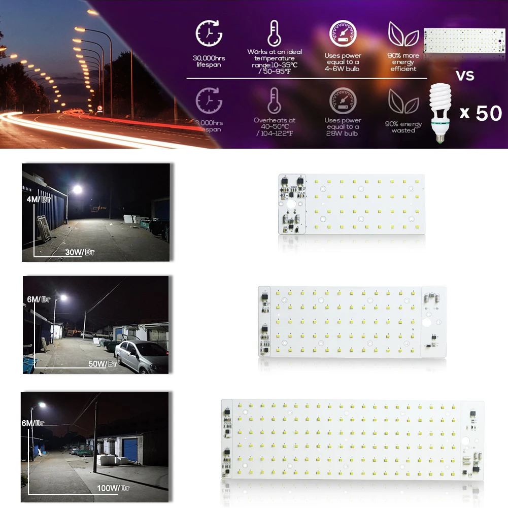 50 Вт, 6000 лм, 3-7 м, Площадь облучения 30-60 квадратных метров.