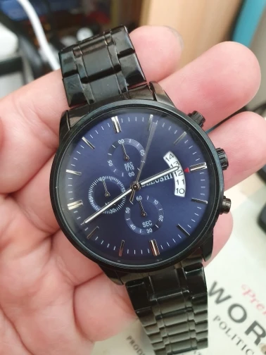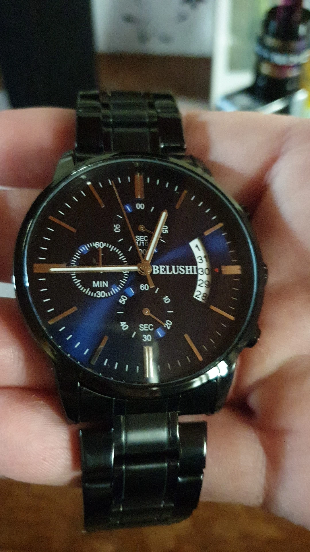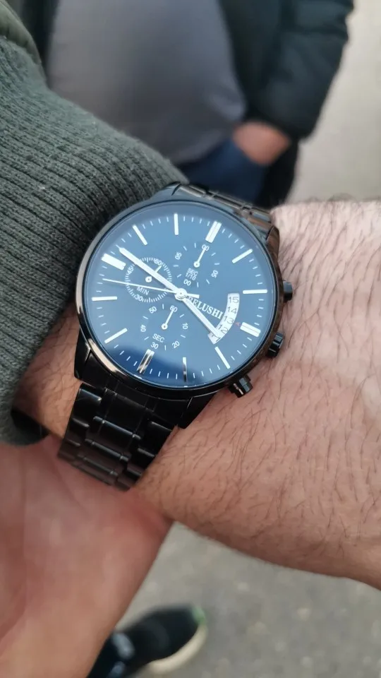 Симпатичные тяжёлые часы. Выглядят дорого. Надеюсь, будут надёжно работать. Секундомер и даты работают. В Питер доставили очень быстро через "пятёрочку".