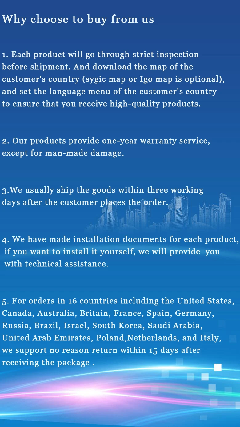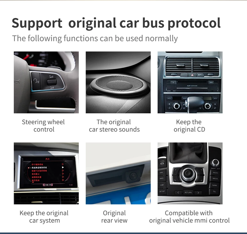 5. Перед размещением заказа, пожалуйста, оставьте сообщение:(1) какая модель и год вашего автомобиля?(2) Пожалуйста, пришлите мне оригинальную автомобильную радио-картинку, позвольте мне проверить, подходит ли она?(3) Есть ли AUX илиAMIВ подлокотнике?