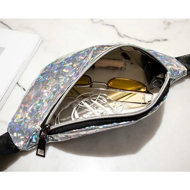 Забавная Женская поясная сумка с лазерной печатью, нагрудная Сумочка для женщин, кошелек, голографические блестки