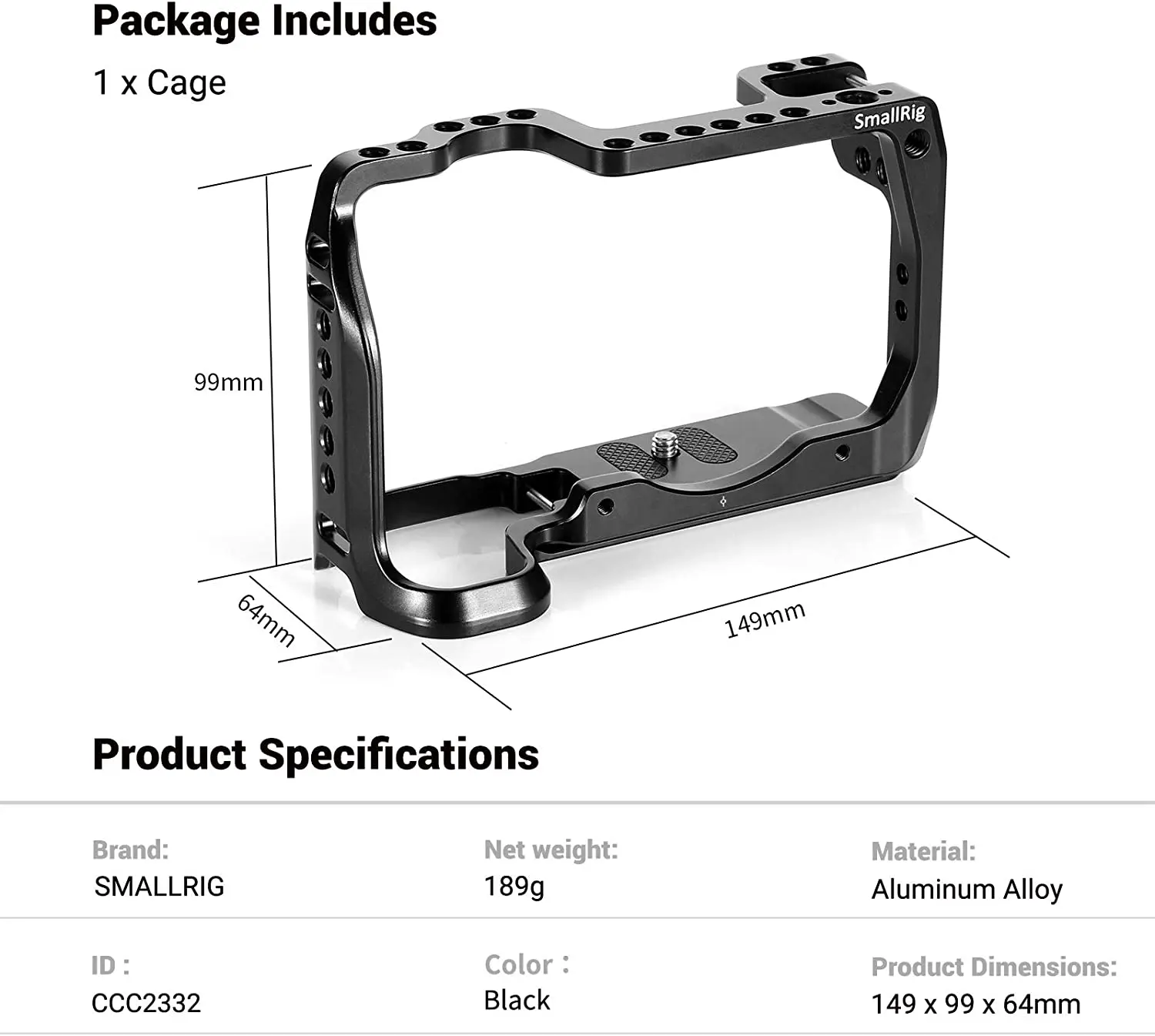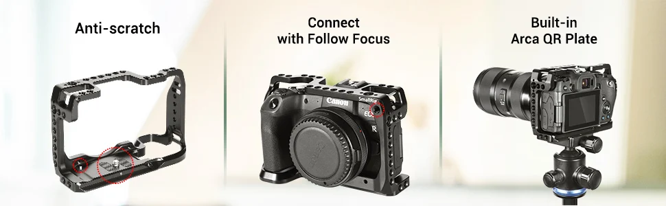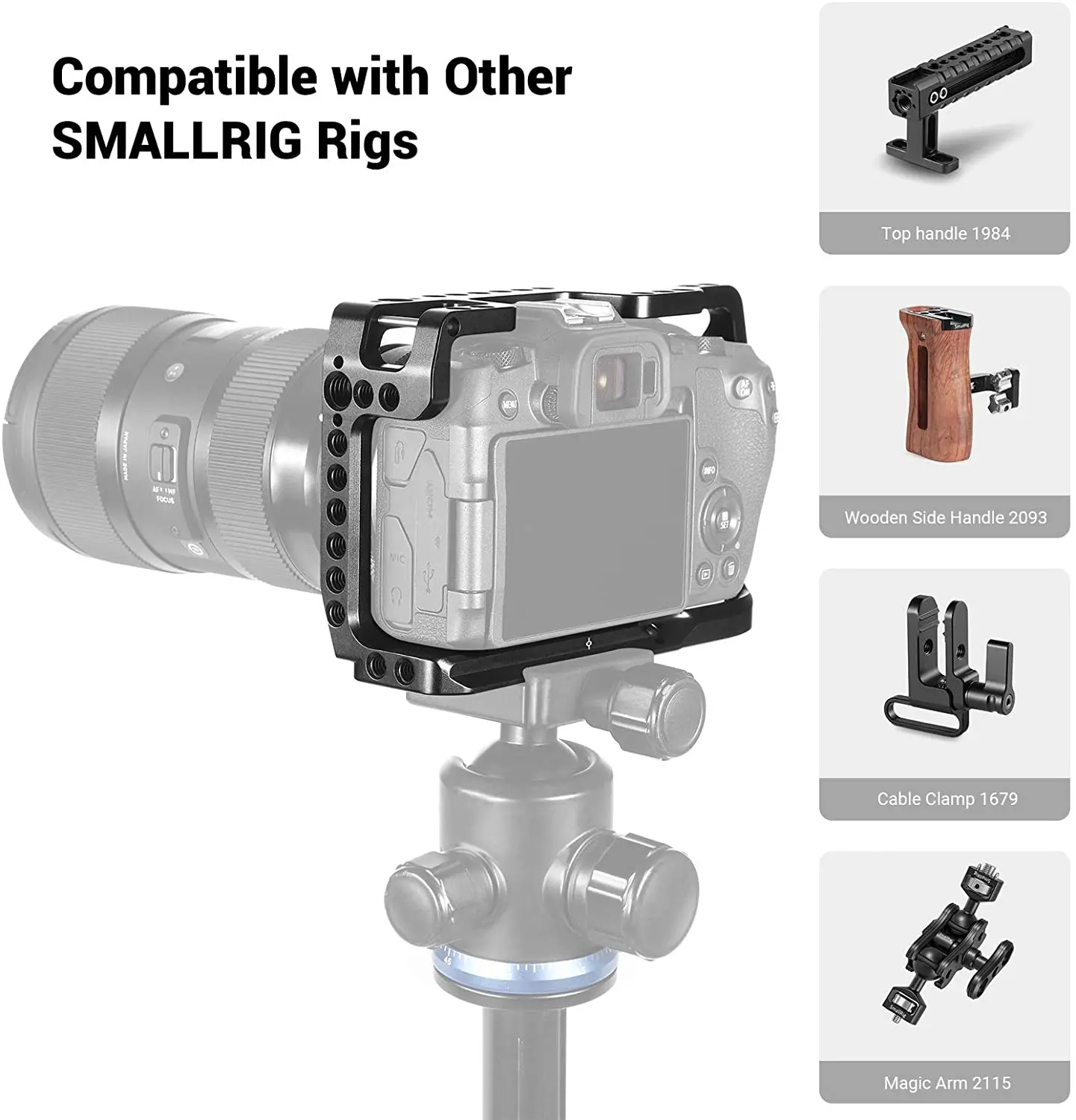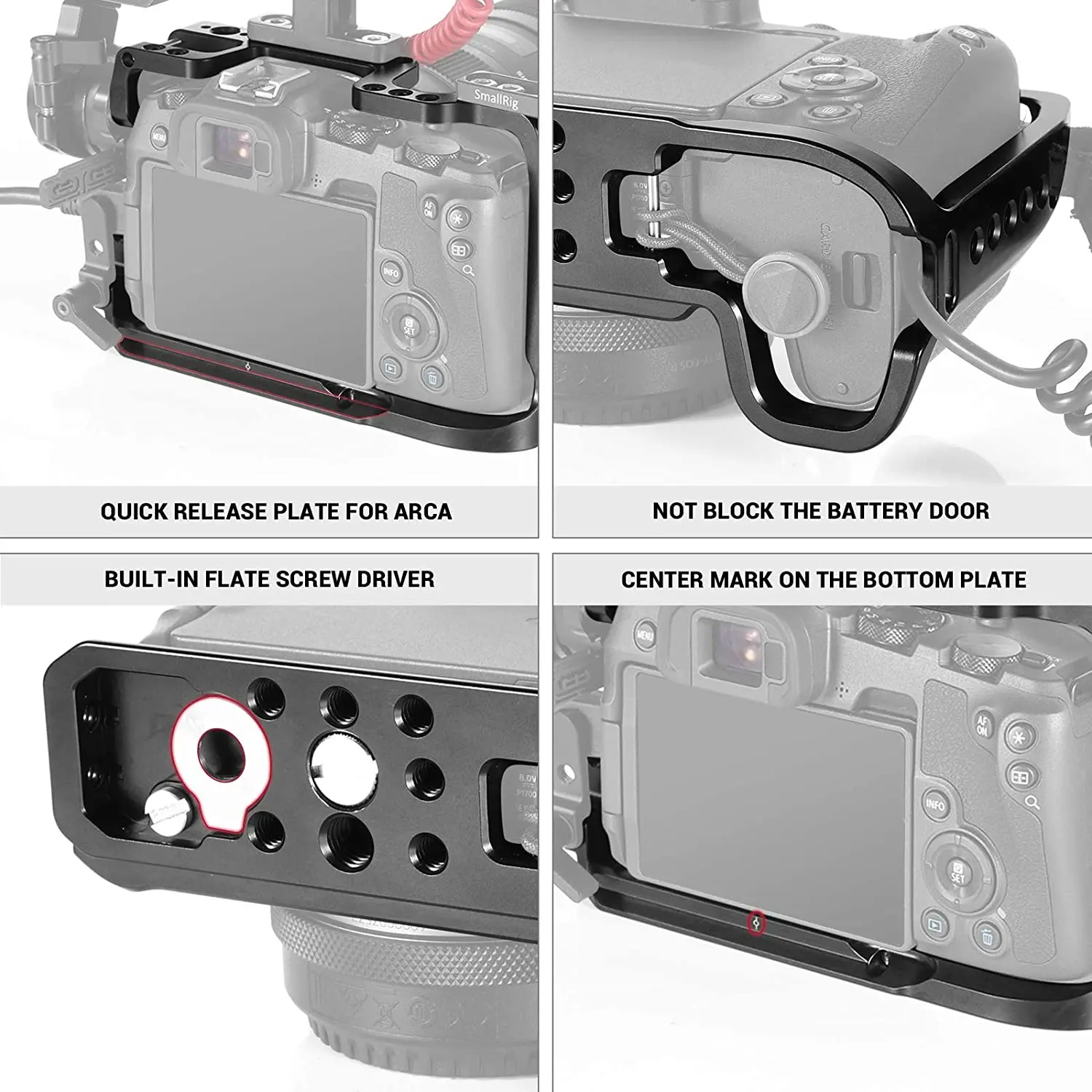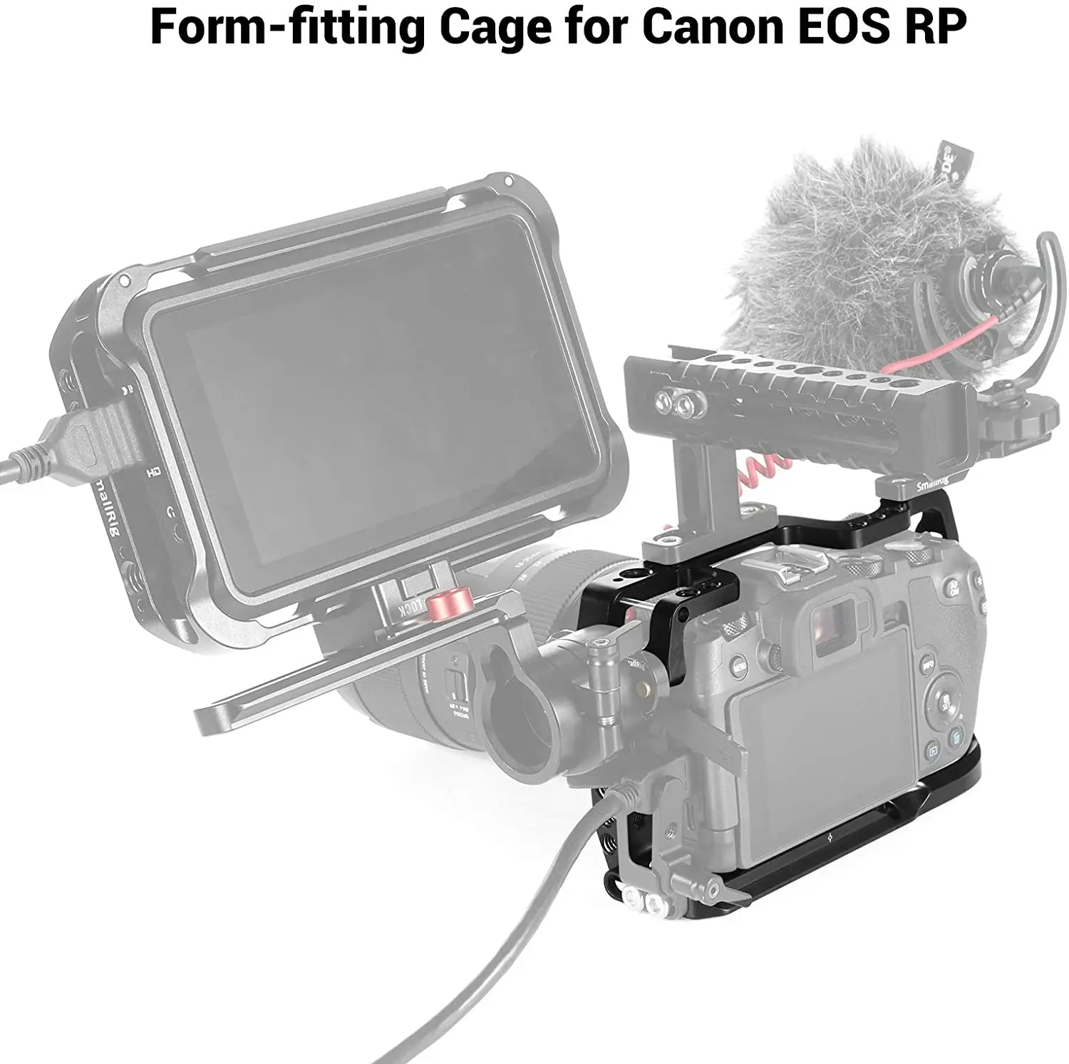 SmallRig клетка для Canon EOS RP CCC2332 Полностью облегающая клетка. Он крепится к штативной розетке камеры винтом 1/4 ''-20, с фиксирующим штифтом и резиновыми подушечками на базовой пластине, чтобы предотвратить скручивание. Поставляется с несколькими резьбовыми отверстиями 1/4 ''-20 и 3/8''-16, позволяющими устанавливать аксессуары. Например, вы можете установить Верхняя ручка SmallRig 1984 И SmallRig деревянная боковая ручка 2093 Для ручной съемки и прикрепления Кабельный зажим SmallRig 1679 Для защиты кабеля и порта HDMI. ARRI отверстия на клетке предназначены для работы с Шаровая Головка SmallRig Magic Arm 2115 Таким образом, монитор может быть установлен без проблем с скручиванием. Клетка имеет встроенную Arca пластину на дне, что делает ее удобной для прямого крепления на Arca-совместимые зажимы. Клетка обеспечивает полный доступ к кнопкам камеры, портам и батарее. Он поставляется с точками крепления для ручных ремней и бретелей на шее. Плоский винт-драйвер в нижней части предназначен для затягивания или отсоединения камеры.