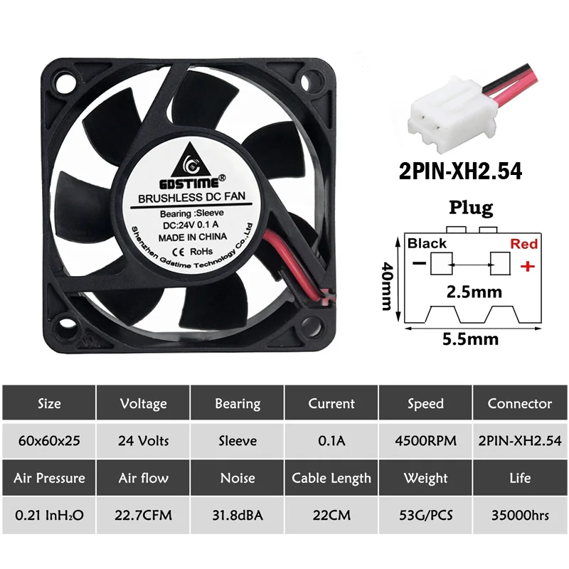 Размеры: 60x60x25 мм Номинальное напряжение: 24 В постоянного тока Разъем: XH2.54-2Pin Тип подшипника: Втулка Номинальный ток: 0,1 а ± 10% Номинальная скорость: 4500 об/мин ± 10% Расход воздуха: 22 куб. Футов в минуту ± 10% Уровень шума: 31, 8 дБА ± 10% Срок службы: 35000 часов Длина кабеля: 25 см Вес: 50 г/шт.