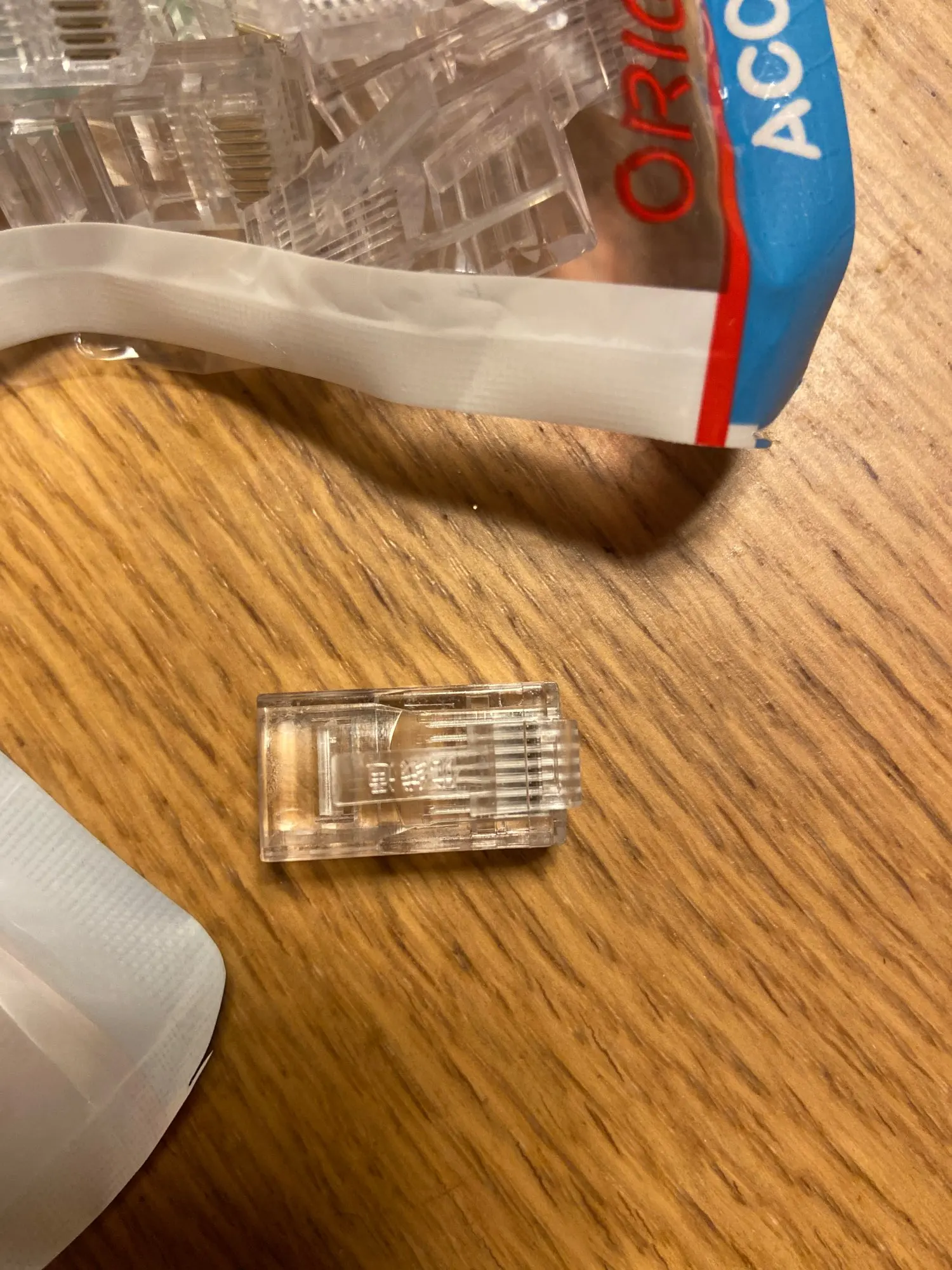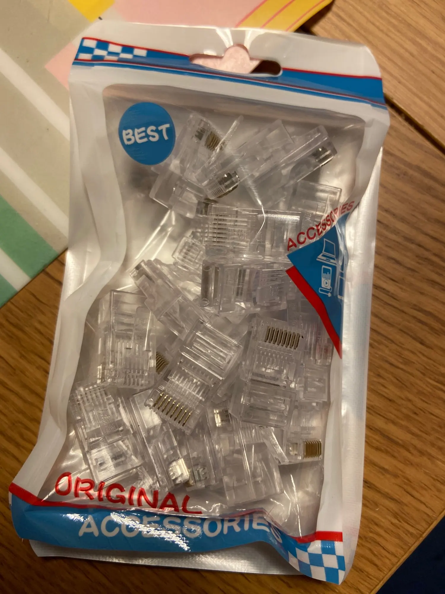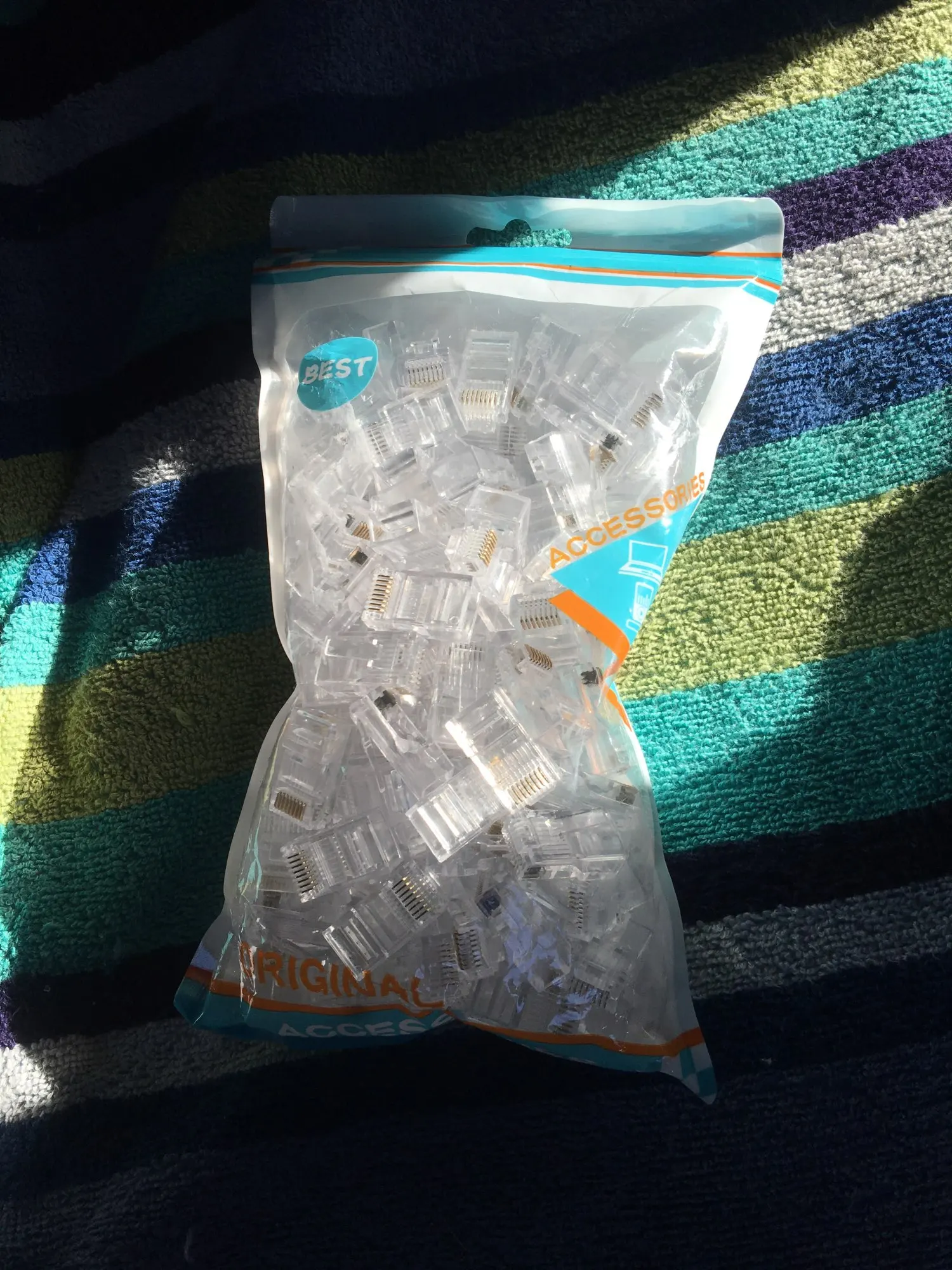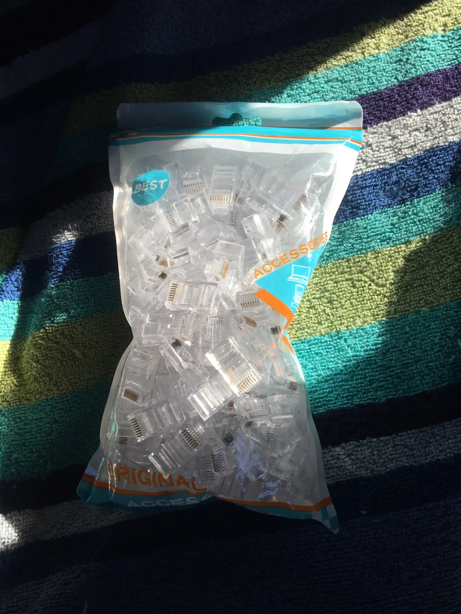 Заказал 05.08, получил 21.08.2020 (17 дней, быстро) на "Новой почте" Киева. Брал 50 штук за $6.59, получается $0.13 за штуку. Набор прибыл, упакованный в почтовый серый п/э пакет с "пупыркой" внутри, в фирменном пакетике с zip-замком. Количество не пересчитывал, и так верю. Общее первое впечатление хорошее, коннекторы выглядят добротно и качественно. Язычок на коннекторах не отламывается сразу при отгибе в обратную сторону, выдерживает около десяти перегибов, пружинистый пластик. Провода входят туго, джеки подходят только для cat. 5/5е с проводниками диаметром не более 1,0 мм. Обжимал обычной обжимкой, потом бокорезами обрезал лишнее, остаются небольшие хвостики, но вхождению в порт никак не мешают. Очень удобно, по сравнению с обычными коннекторами, особенно если витая пара слишком мягкая и гибкая и плохо поддаётся формовке.