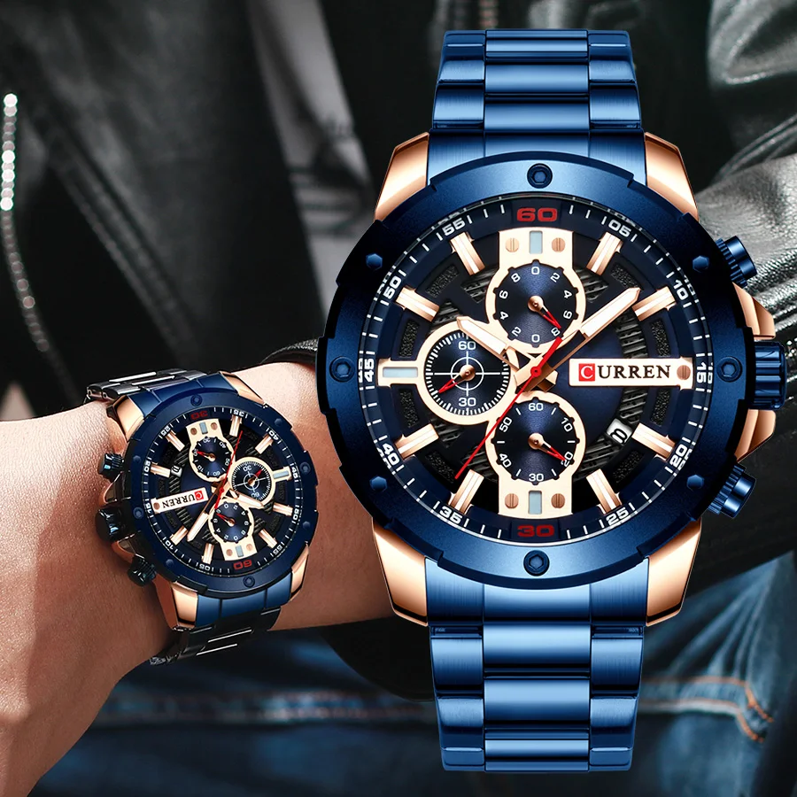 CURREN Модные мужские спортивные часы с синим ремешком из нержавеющей стали, кварцевые наручные часы с хронографом, водонепроницаемые военные часы Relogio Masculino