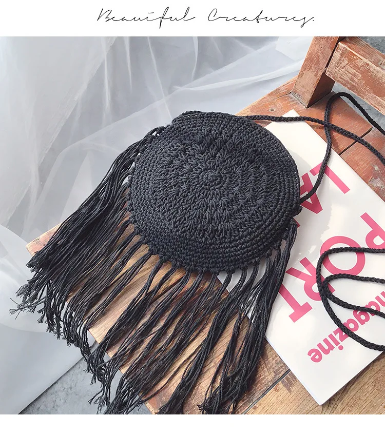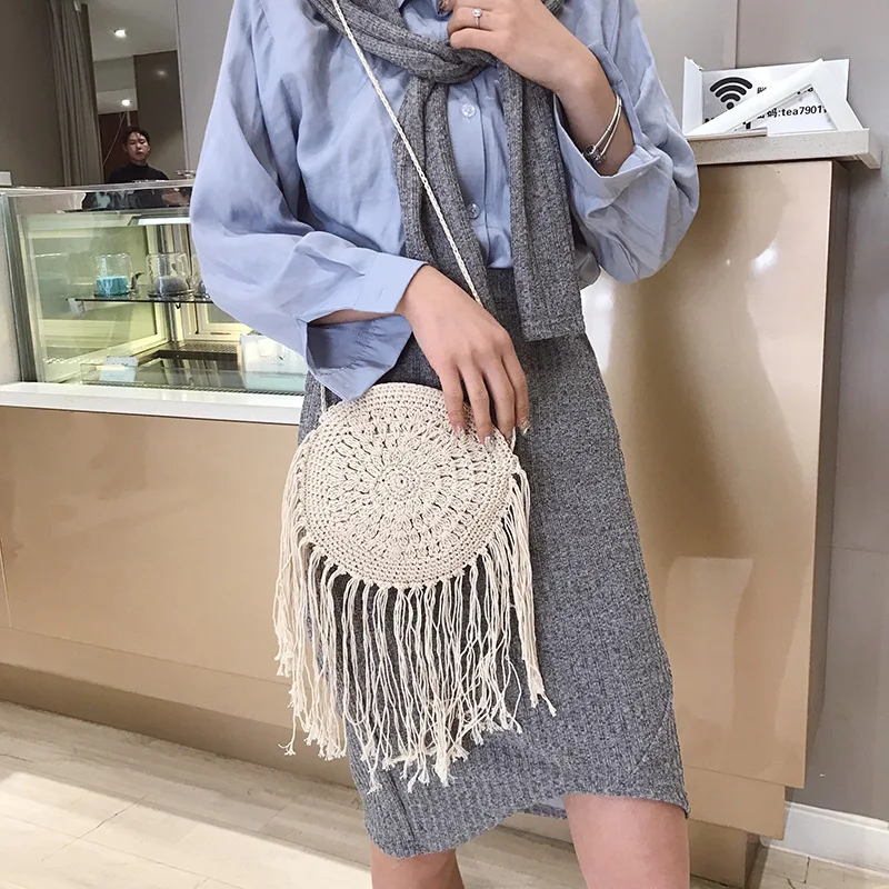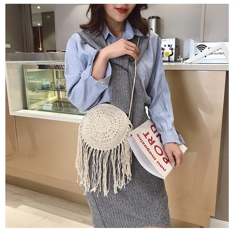 Женская Соломенная Сумка через плечо, круглая, с кисточками, из ротанга