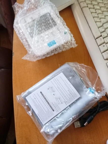 Заводскую коробку упаковали в почтовый пакет с пупыркой. Сам аппарат отличный, питается как от 4 батаретипа АА или при помощи кабеля от USB. Таким образом можно даже от power bank запитать, очень удобно. Есть поддержка 2х пользователей. Подсветки экрана нету.