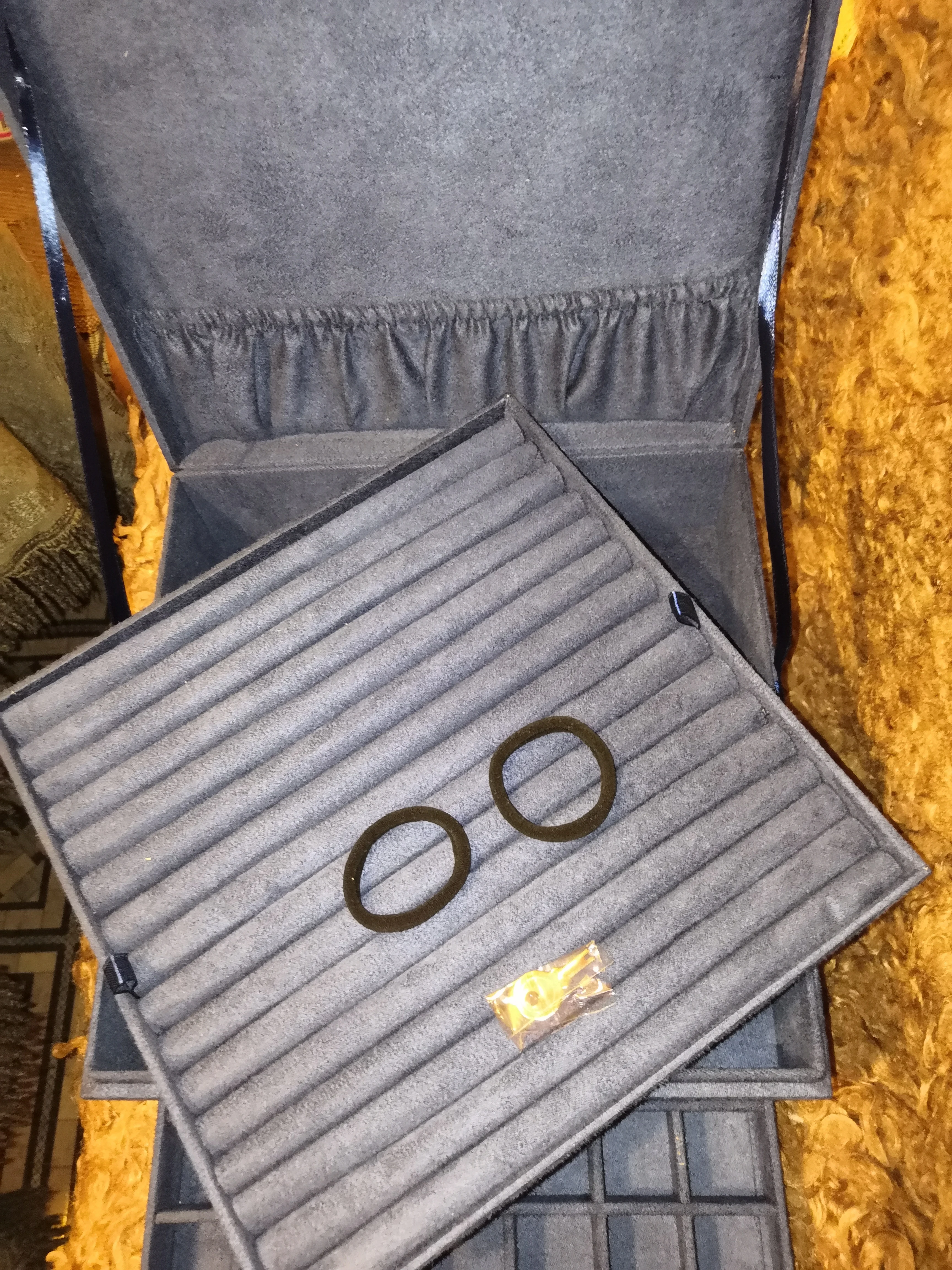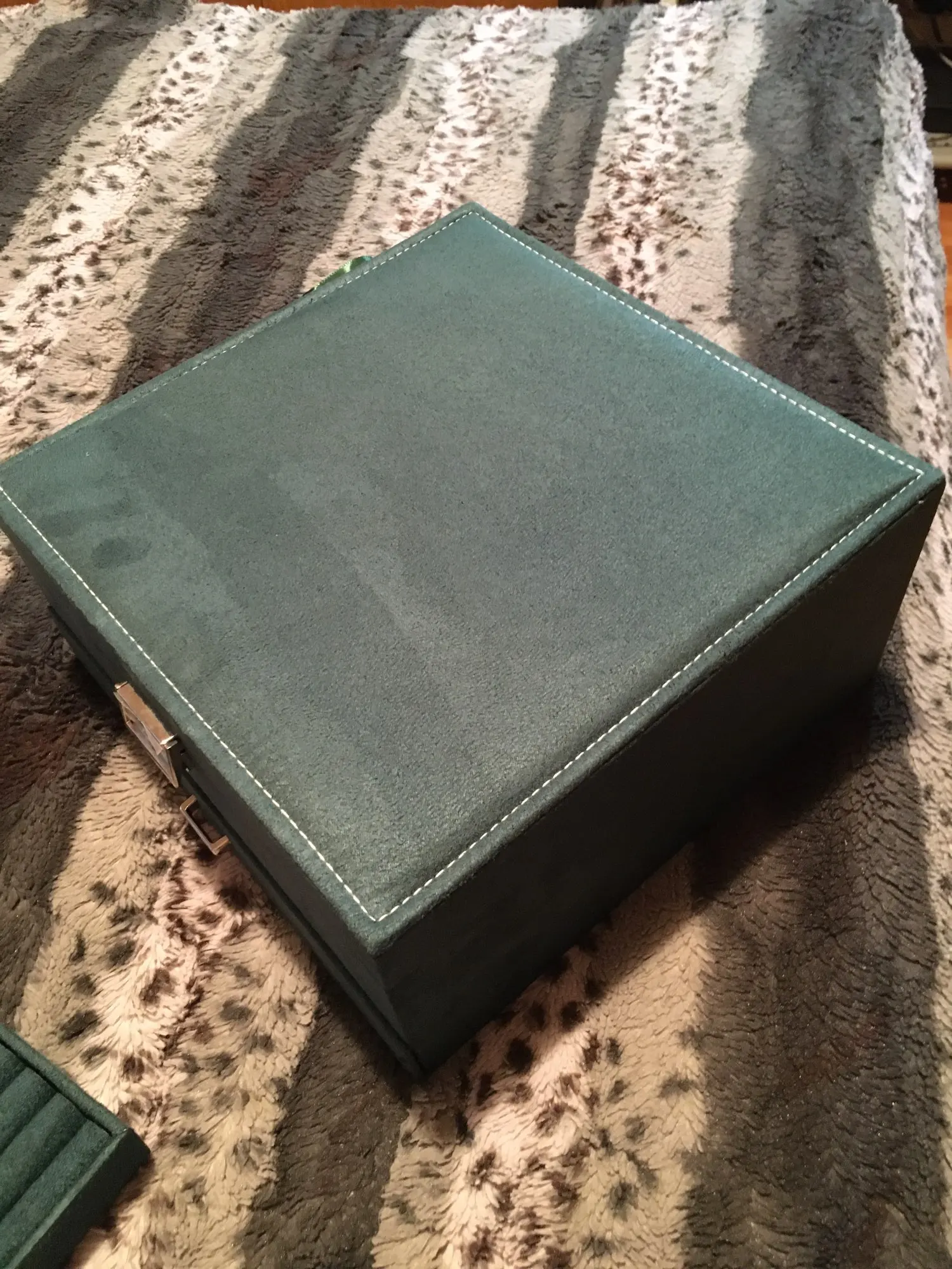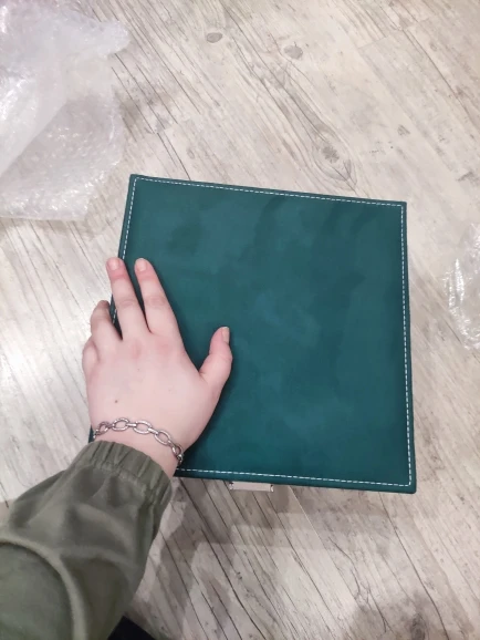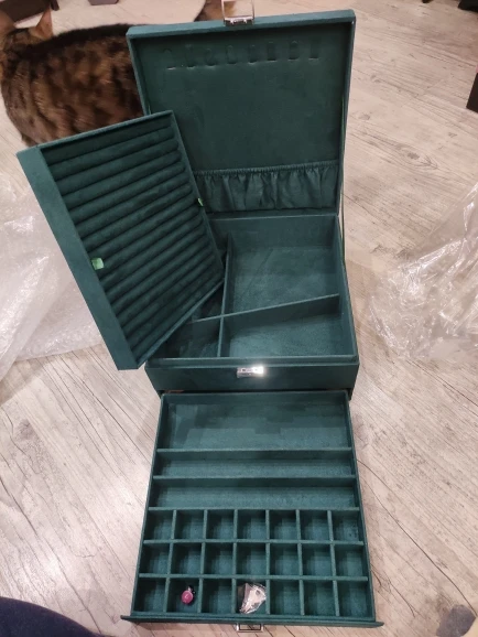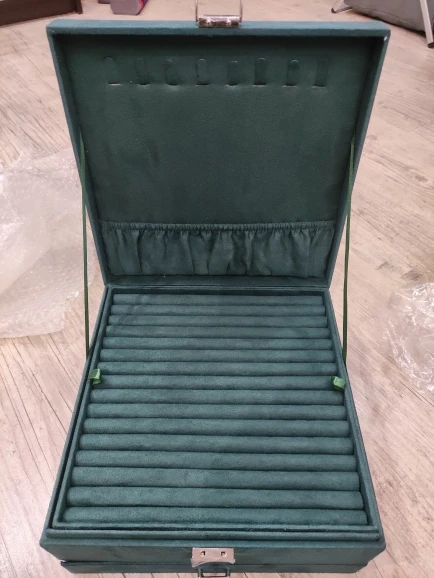 Ювелирный товар очень хорошо упакован, и он очень маленький! Я очень доволен этим, хотя качество не самое лучшее. Часть, подходящая кольцам,-это картон, а не коврик, поэтому я не знаю, будет ли он деформироваться со временем, а углы не очень хорошо обработаны, но я все еще доволен. Он очень широкий и хорошо использует пространство. Зеленый цвет очень элегантный и делает ювелирные изделия очень ценными. Я также связался с продавцом и очень быстро ответил. Подарочные 2 резинки для волос! Большое спасибо продавцу!