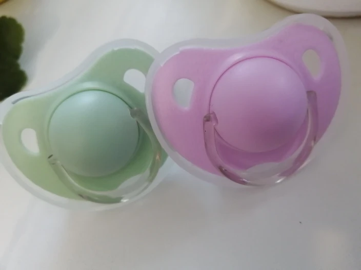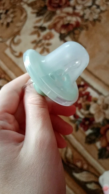 Наш ребёнок с детства берет только такие круглые пустышки. В аптеках их уже не найдёшь, или анатомические или под Авент узкие. И те и другие ребенок выплевывает. Поэтому заказываем всегда на Али. Эту покупала по распродаже, за 89.92 руб. Покупкой довольна очень, брала 2 шт, в нежно - фиалковом и мятном цвете. Цветная часть ребристая, с выбитым рисунком. Силикон упругий, не липнет, есть контейнер. Однозначно - лайк