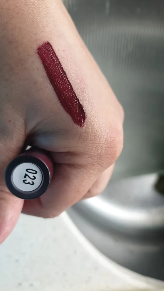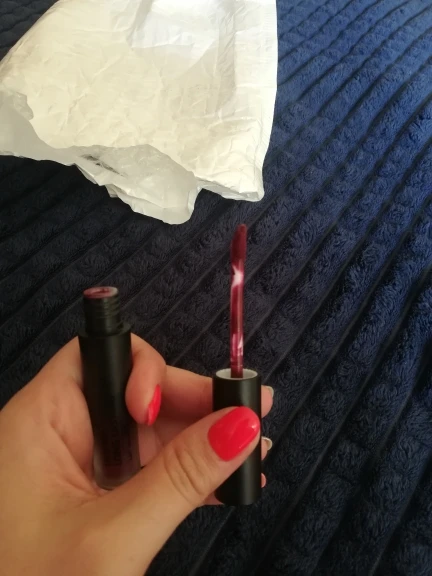 Красный цвет губ, который немного прилипает, не удерживает долгое время, очень легко удаляет, что очень жаль