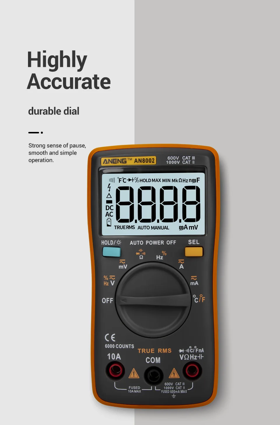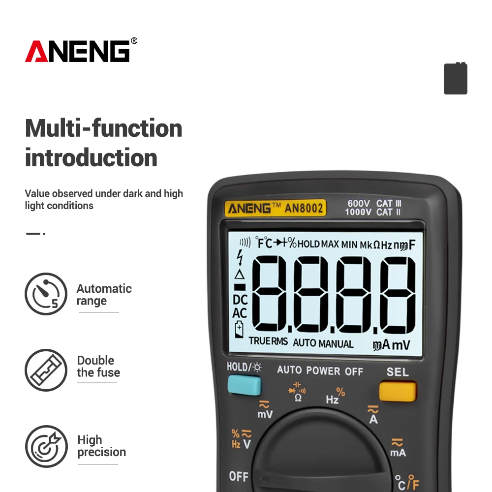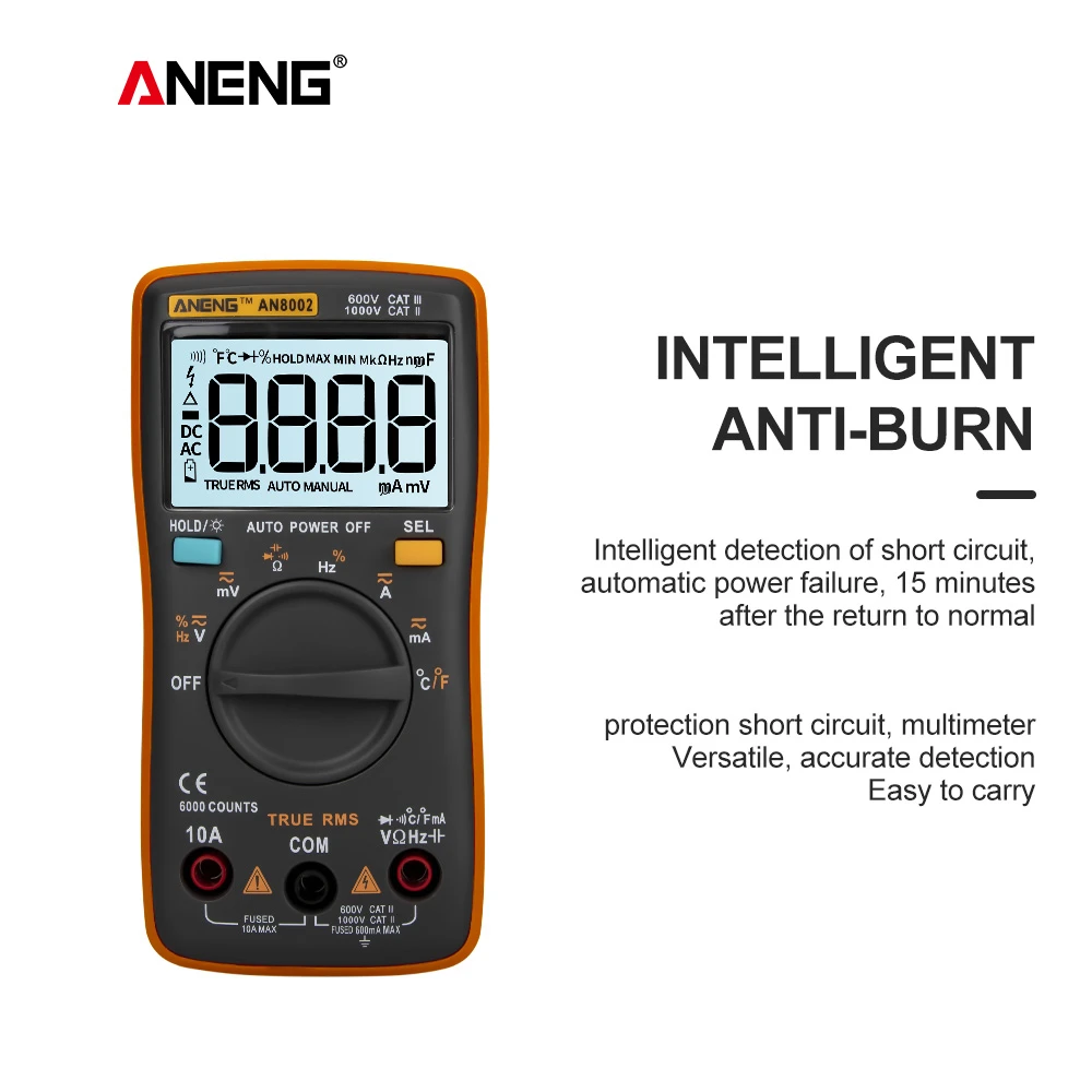 Цифровой мультиметр ANENG AN8002, 6000 отсчетов, подсветка, амперметр переменногопостоянного тока, вольтметр, Омметр, зажим типа крокодил, перемычка, провод для тестирования
