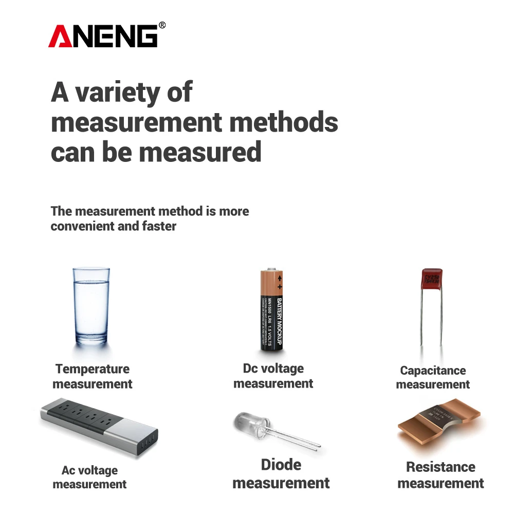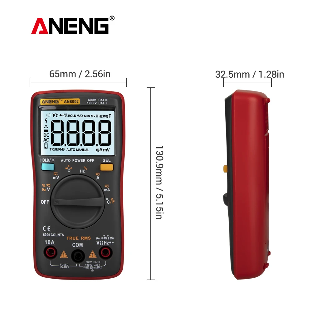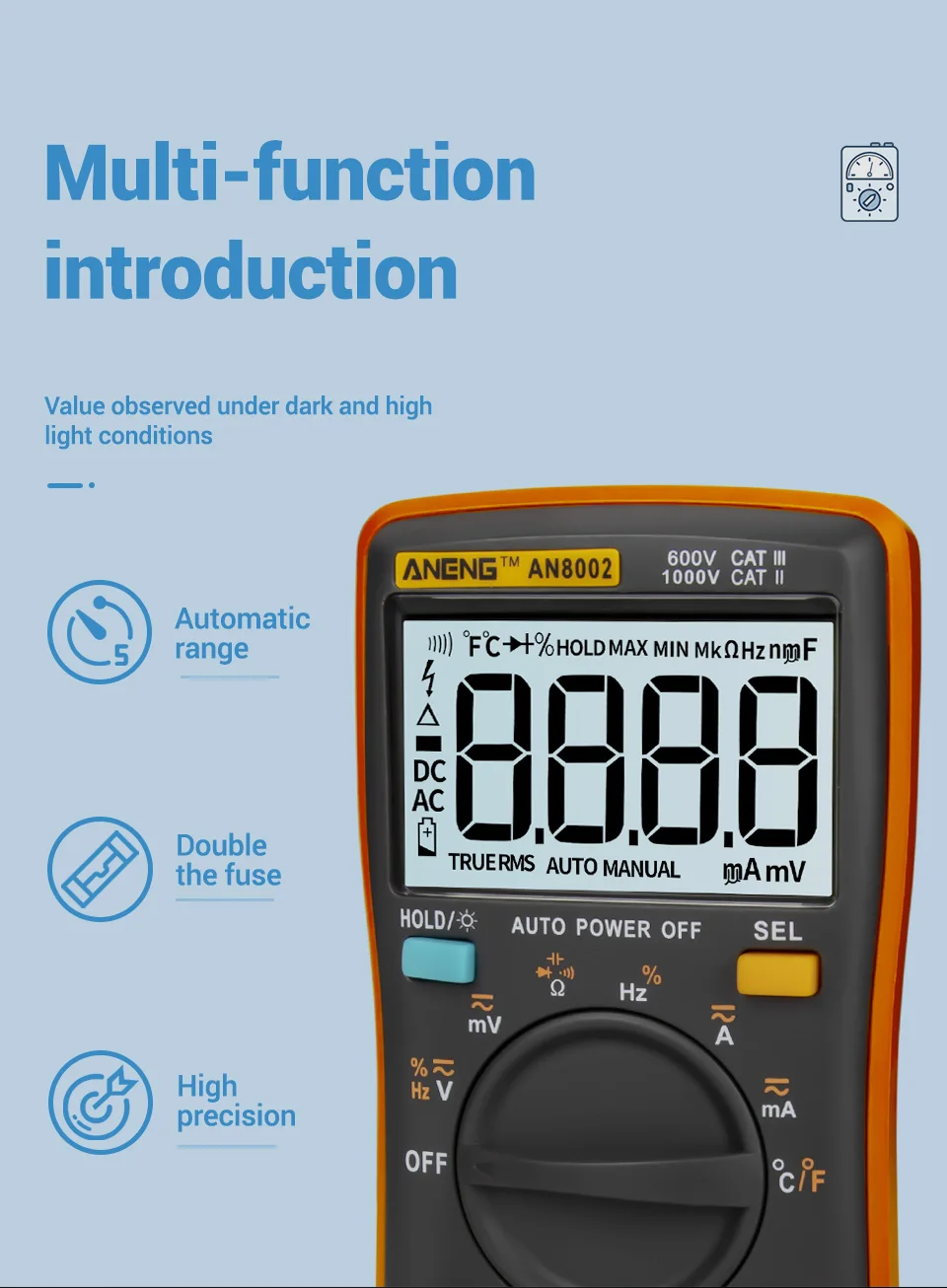 Цифровой мультиметр ANENG AN8002, 6000 отсчетов, подсветка, амперметр переменногопостоянного тока, вольтметр, Омметр, зажим типа крокодил, перемычка, провод для тестирования