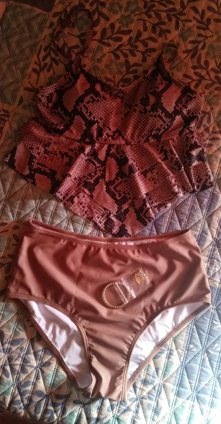 интересный купальник. красивый дизайн. на них 44 подошло идеально. ещё два подарка: резинка и браслет