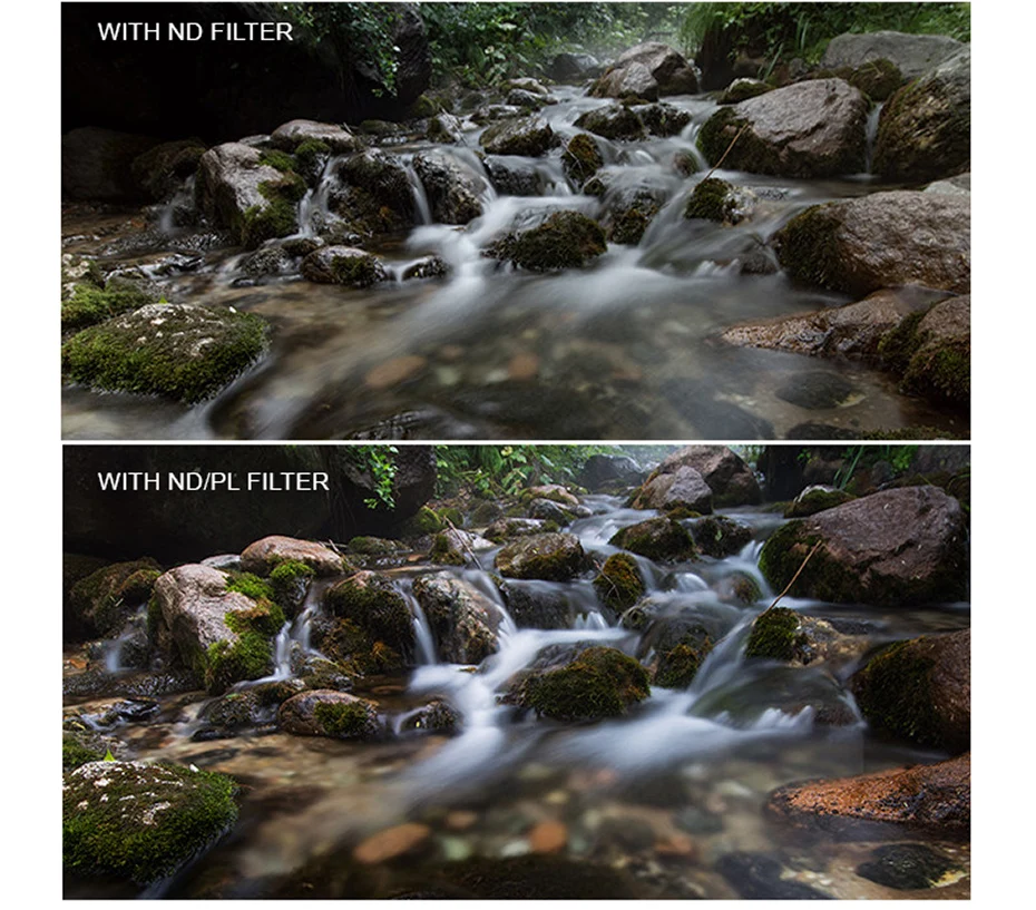 Фильтр ND-PL Сочетает линзы ND и PL для прорыва ограничения традиционных фильтров. Он сочетает в себе преимущества двух фильтров при этом отвечает требованиям фотографа для увеличенного времени экспозиции и устранения нежелательного поляризованного света, что делает его мощным инструментом для пейзажной фотографии.