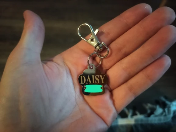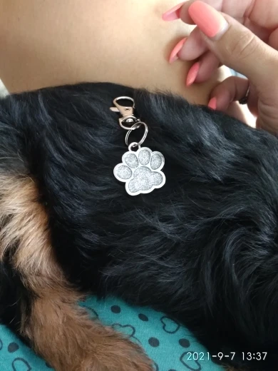 Товар прибыл вовремя. Очень легкая упаковка. Медальон соответствует и надпись превосходного розового цвета. Медальон все еще слишком велик для нашей собаки почти 3 месяца. Есть дополнительное кольцо. Спасибо...