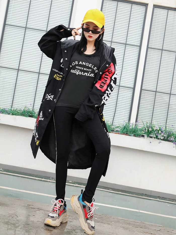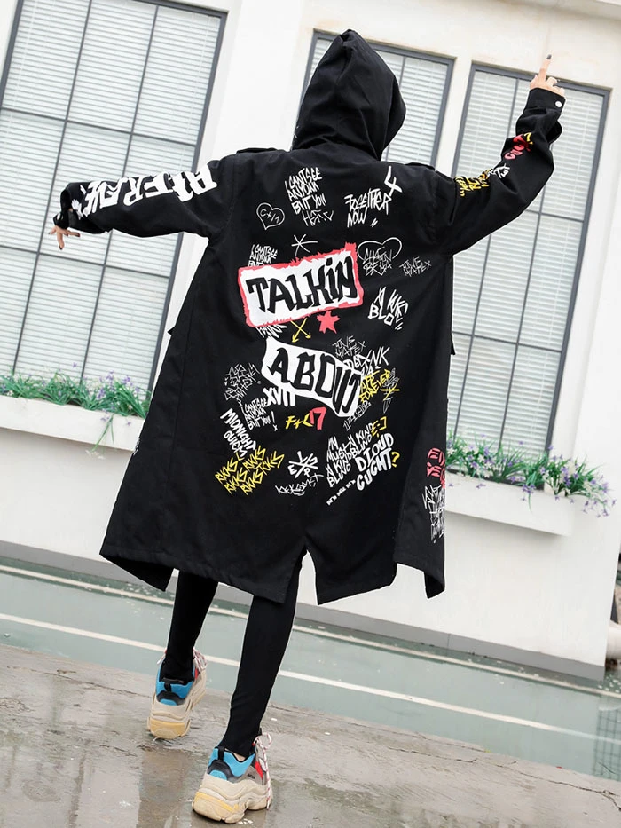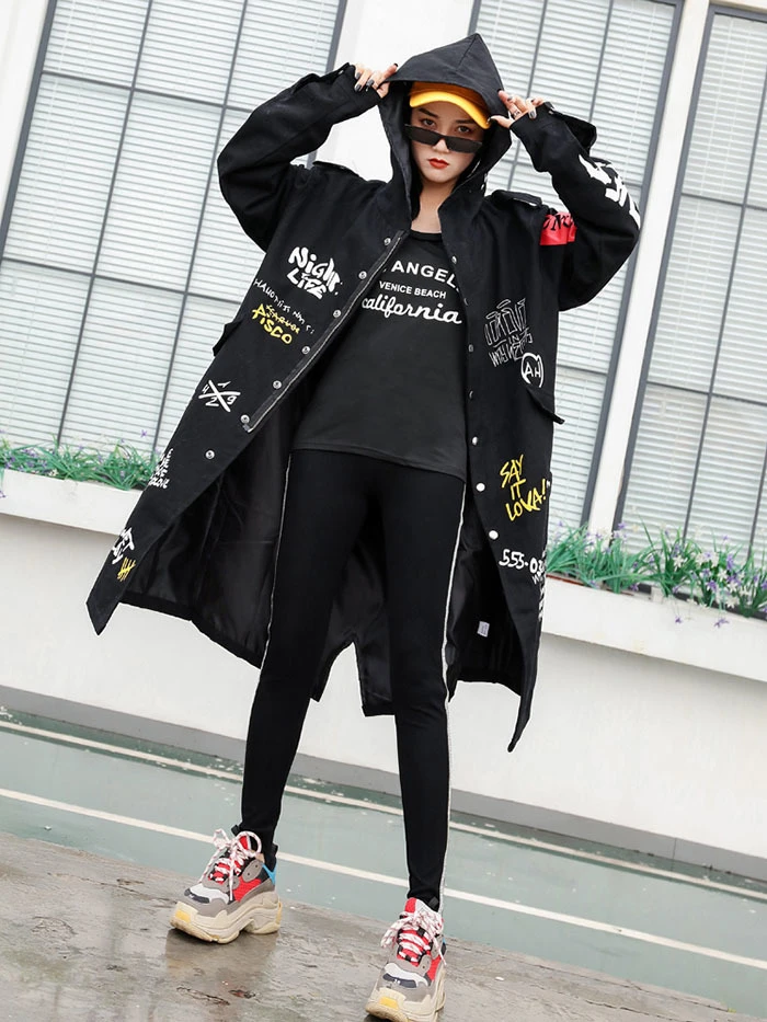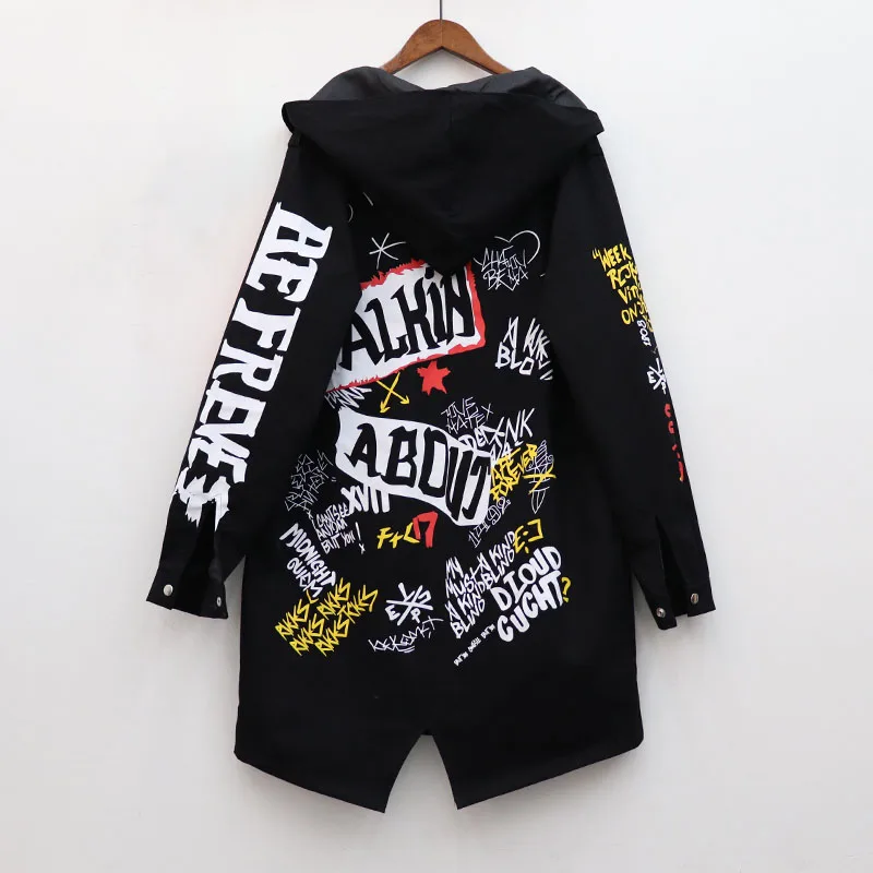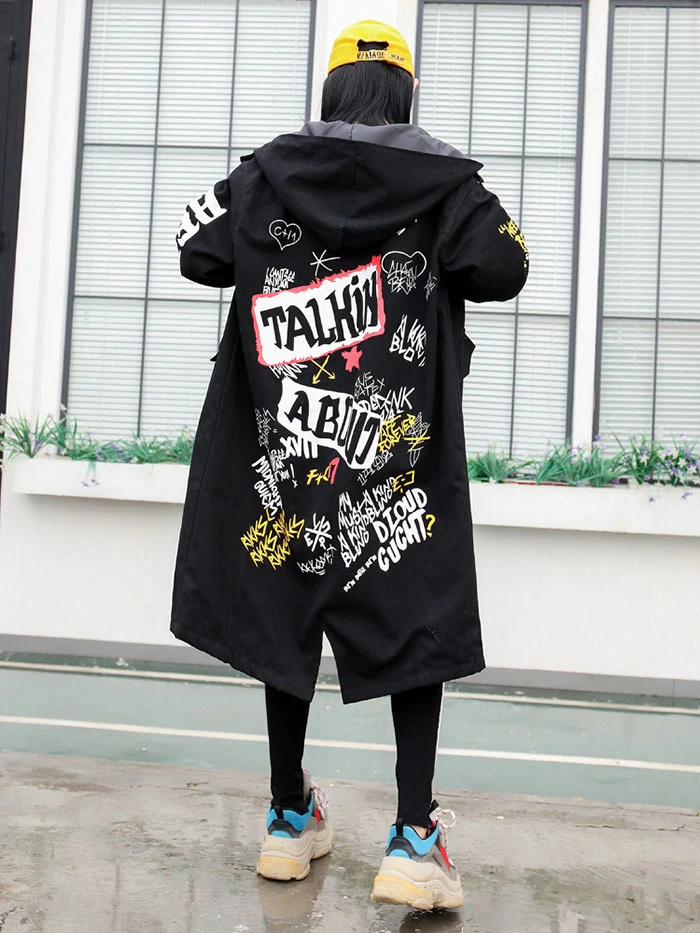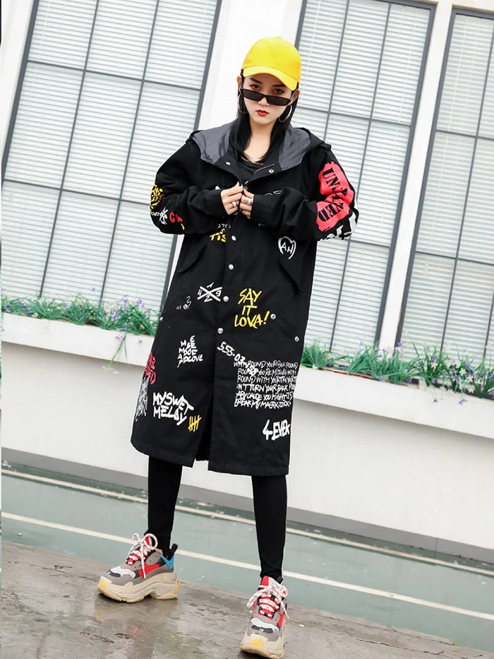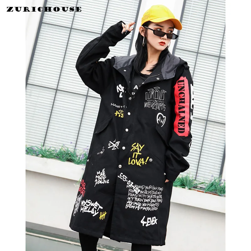 ZURICHOUSE Женское длинное пальто в стиле хип-хоп с принтом граффити, модный уличная одежда большого размера на весну и осень, черный плащ с капюшоном