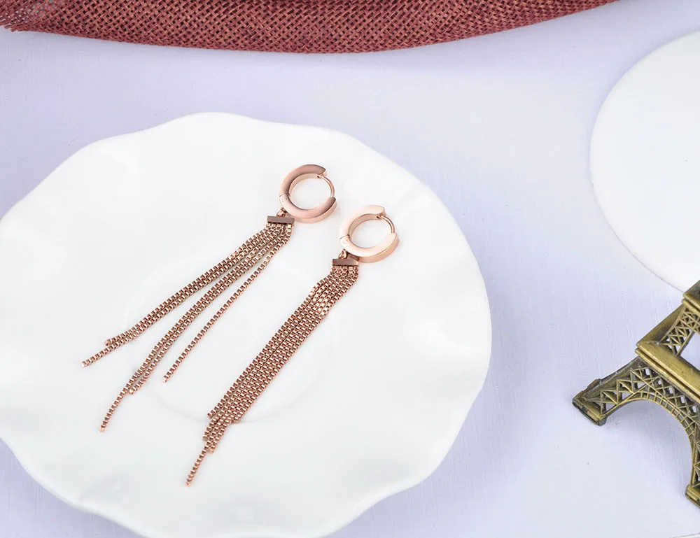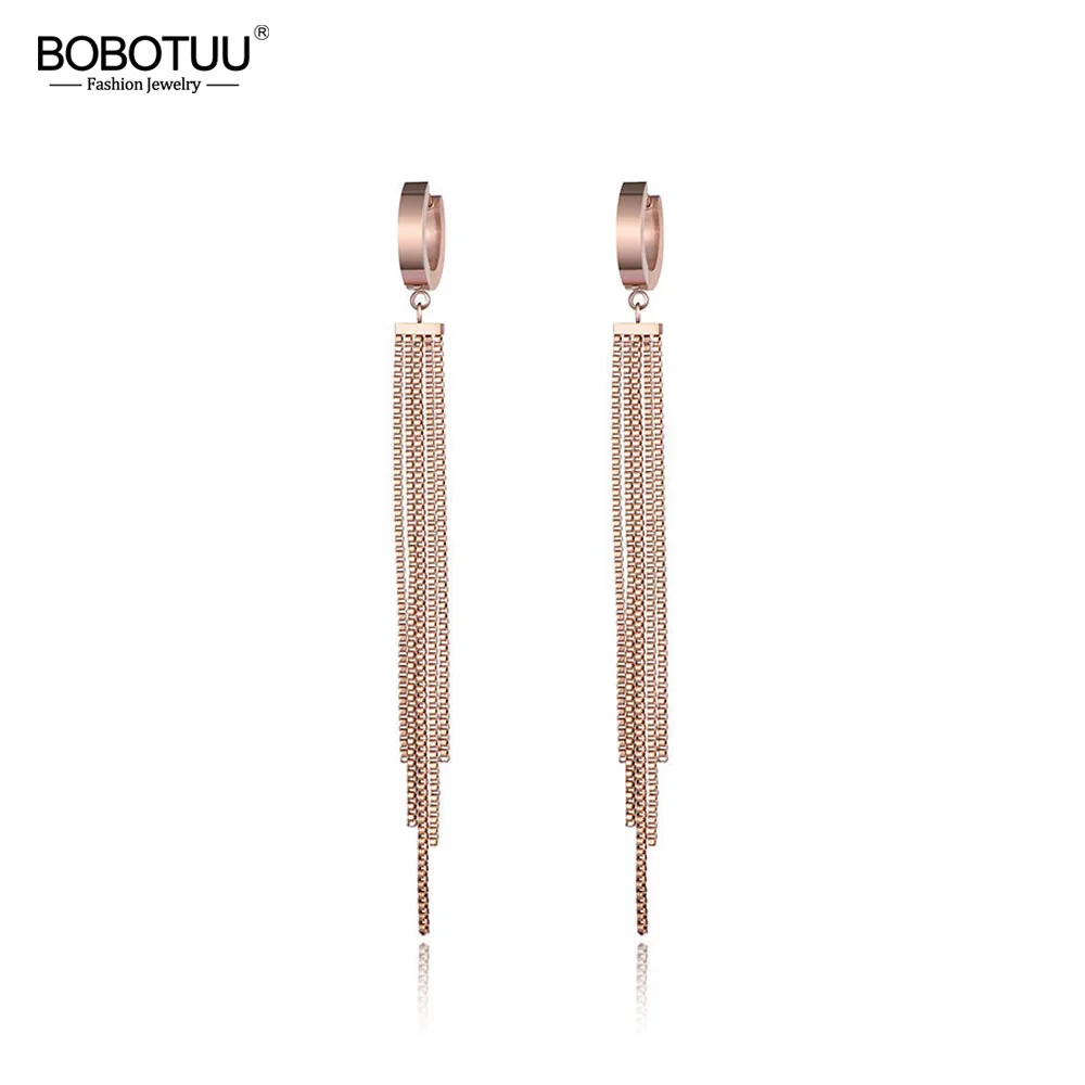 Женские свадебные серьги-кольца BOBOTUU, серьги цвета розового золота с длинными кисточками из титановой стали, вечерние серьги в подарок, BE17069