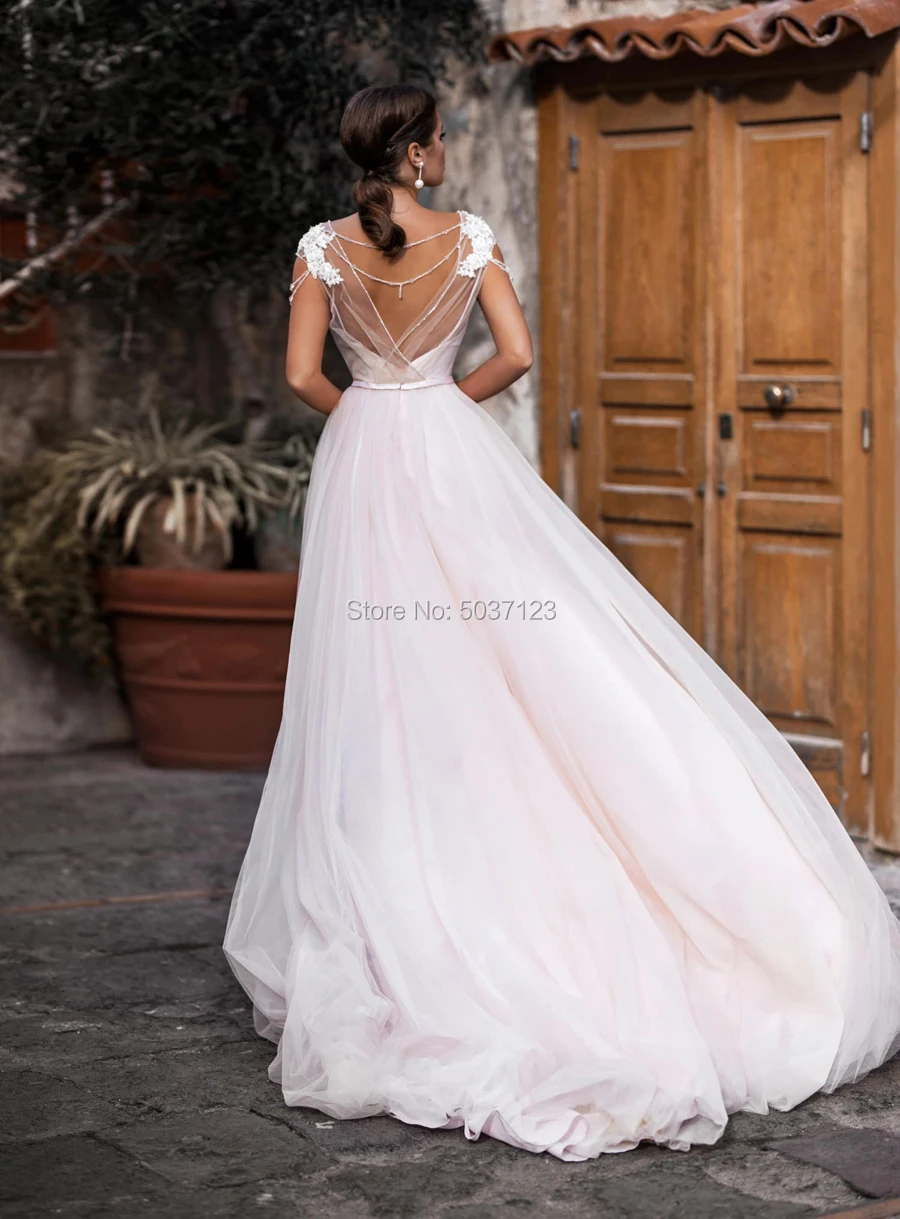 Розовое Тюлевое свадебное платье трапециевидной формы 2020 Vestido De Noiva с рукавами-крылышками и кружевной аппликацией, расшитое бисером, с открытой спиной, свадебное платье в богемном стиле