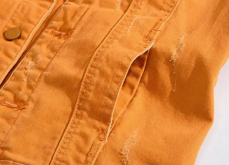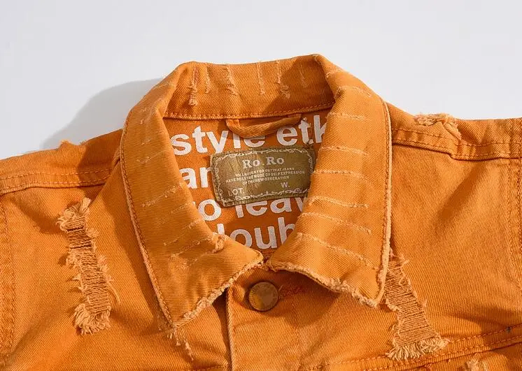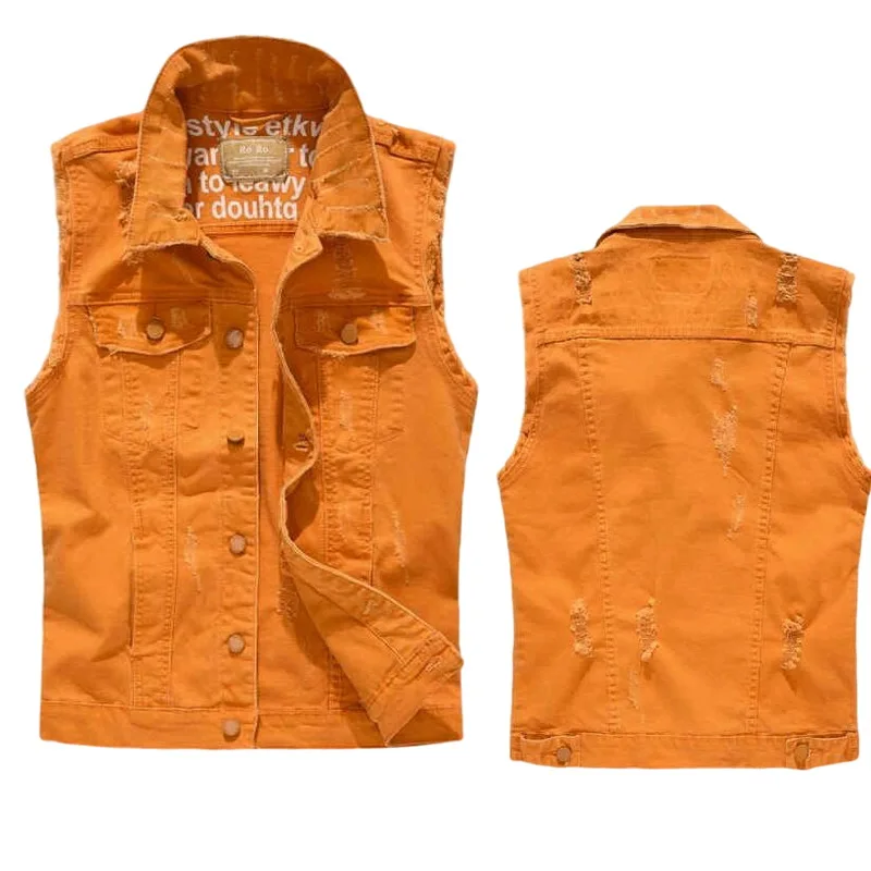 Мужской джинсовый жилет, оранжевая приталенная рваная стрейчевая джинсовая куртка с бахромой, без рукавов, с дырками, потертая жилетка, повседневный джинсовый жилет