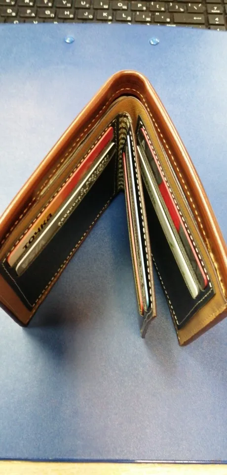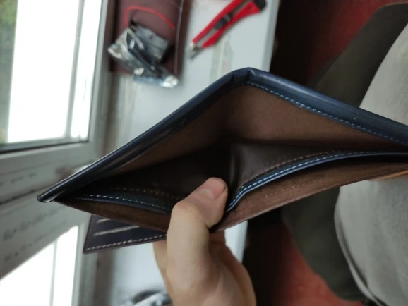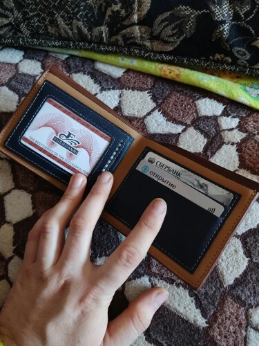 Из плюсов: качественная работа, смотрится очень красиво. Аккуратные строчки. Быстрая доставка и отправка. Из минусов (лично для меня): великоват. Много лишнего расстояния для денег. Ношу в джинсах, этот размер больше обычного. На фото сравнение со старым кошельком.