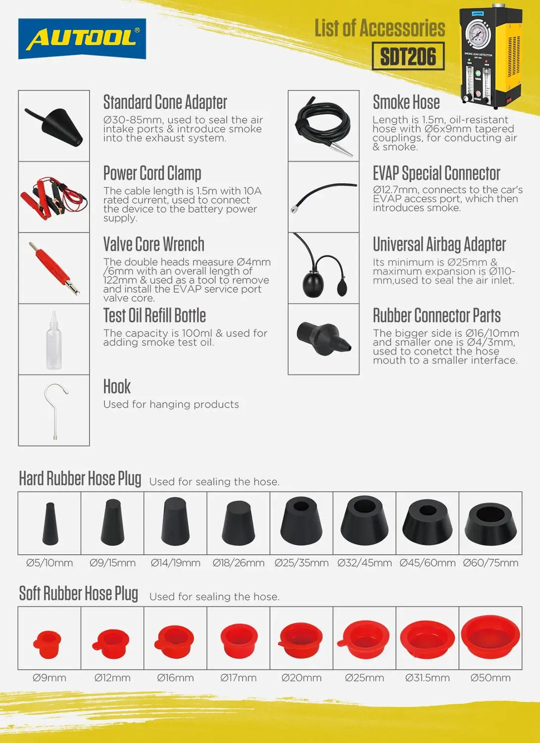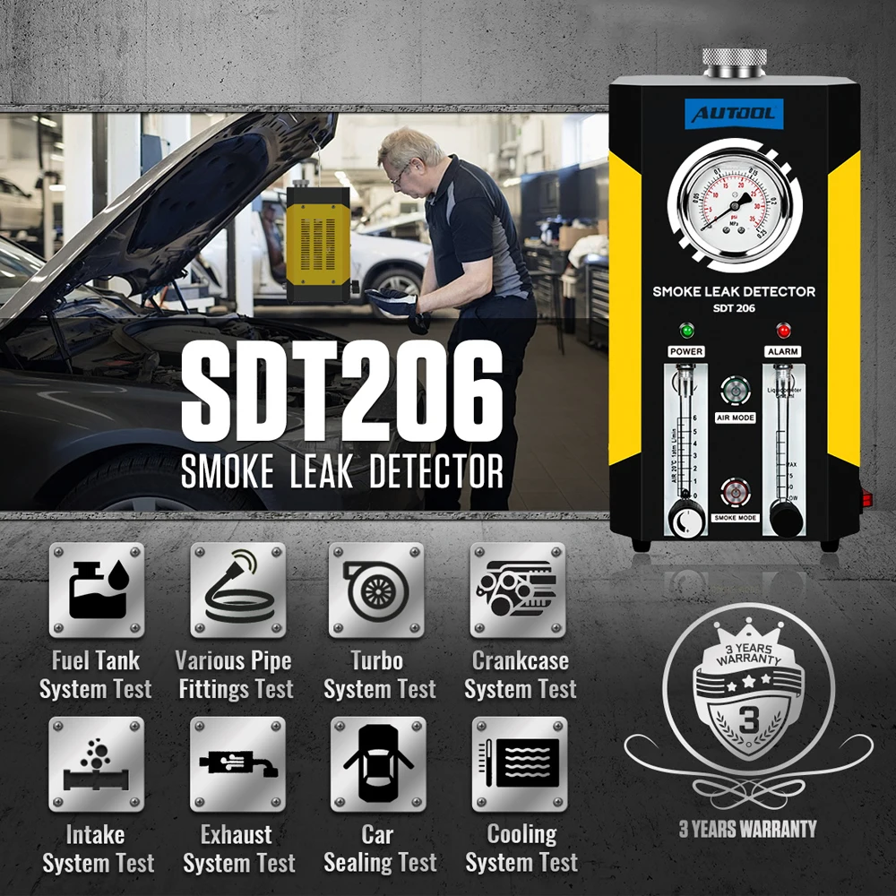 ★2019 AUTOOL SDT 206-- SDT-206 2019 с двумя режимами (Режим дыма и воздушный режим) Предназначен для обнаружения утечки трубопроводной системы на автомобилях, мотоциклах, снегоходах, внедорожниках, квадроциклах, лодках-светильник и скоростных лодках. Например, система воздухозаборника топливной трубы и охлаждающий бак.