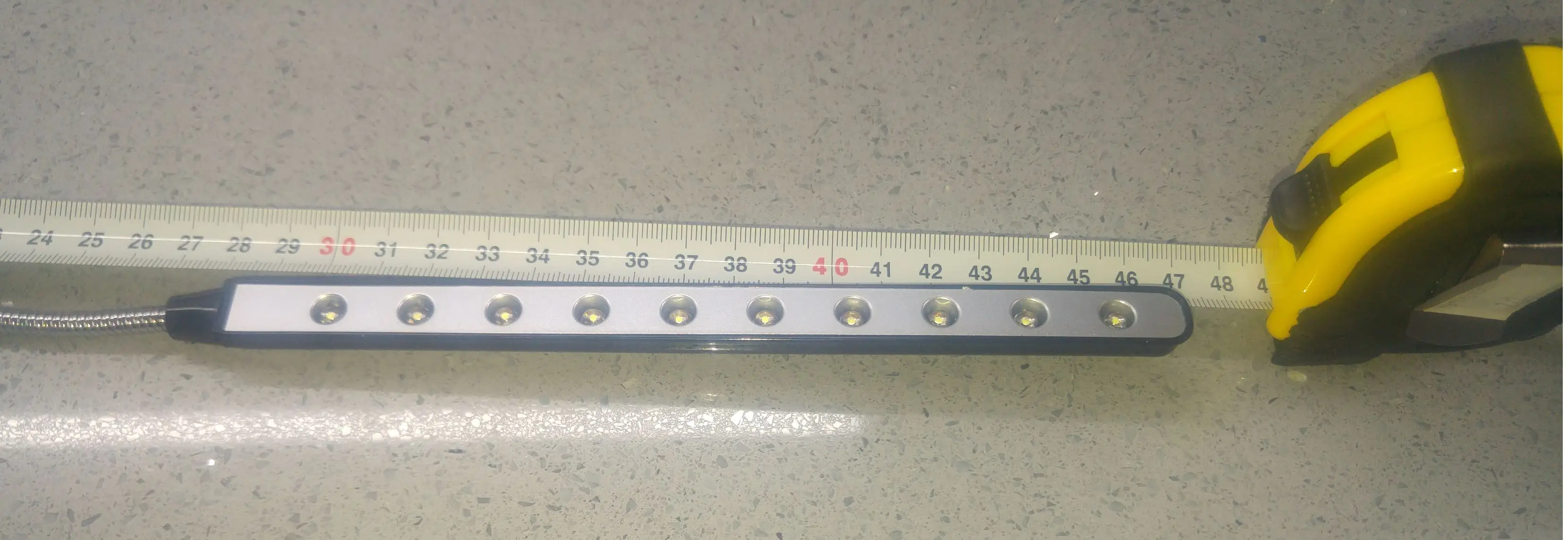 На фотках казался меньше. Светильник толщиной с мизинец, длинный. Немного греется в нижней части лампы, по ощущениям градусов до сорока. Когда вытащил из пакета, немного болталась серебристая часть со светодиодами, вдавил пальцами на место и стало норм. Качество среднее, есть небольшие косячки (см. фото)