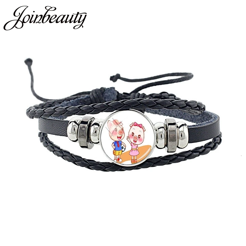 JOINBEAUTY прекрасный животный розовый поросенок художественное изображение стеклянный кабошон черный кожаный браслет многослойный Плетеный мужской женский браслет QF710Фото продукта: