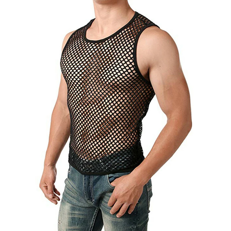 Мужская Сетчатая футболка для занятий в тренажерном зале, майка с рыбной сеткой, спортивный прозрачный сексуальный топ, жилет!