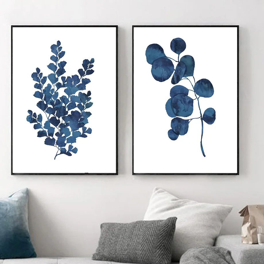 Картина на холсте с синими свежими листьями, Раскрашивание растениями, скандинавские постеры и принты, настенные картины для декора гостиной