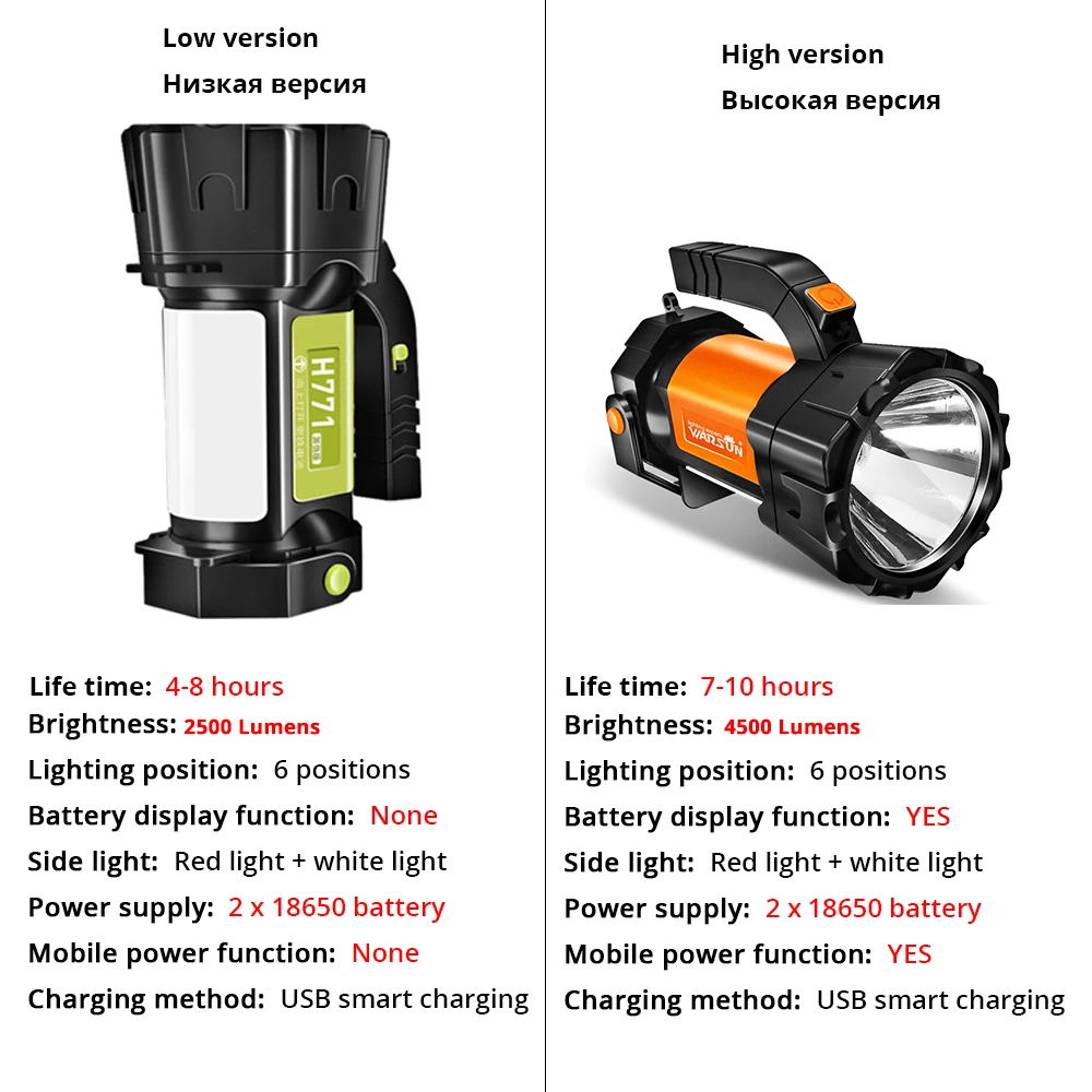 Яркость: 4500 люменПоложение освещения: 6 положенийФункция отображения батареи: естьСветильник: Красный светильник + светильникПитание: 2 батареи 18650 (время работы 7-10 часов)Функция мобильного питания: ДаСпособ зарядки: умная USB-зарядка