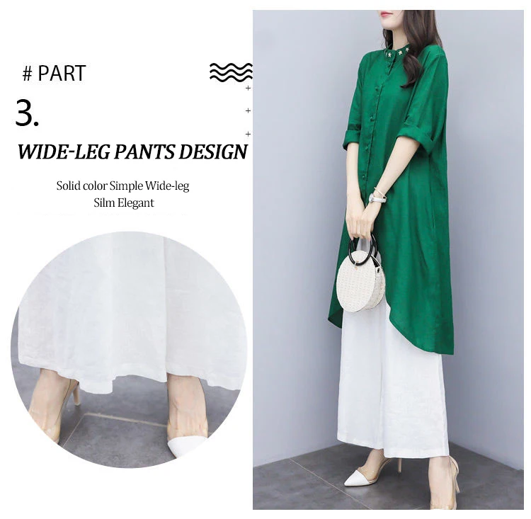 Костюм женский из двух предметов, простой элегантный топ и брюки с художественной вышивкой, размера плюс свободная длинная рубашка с воротником-стойкой и широкими штанинами