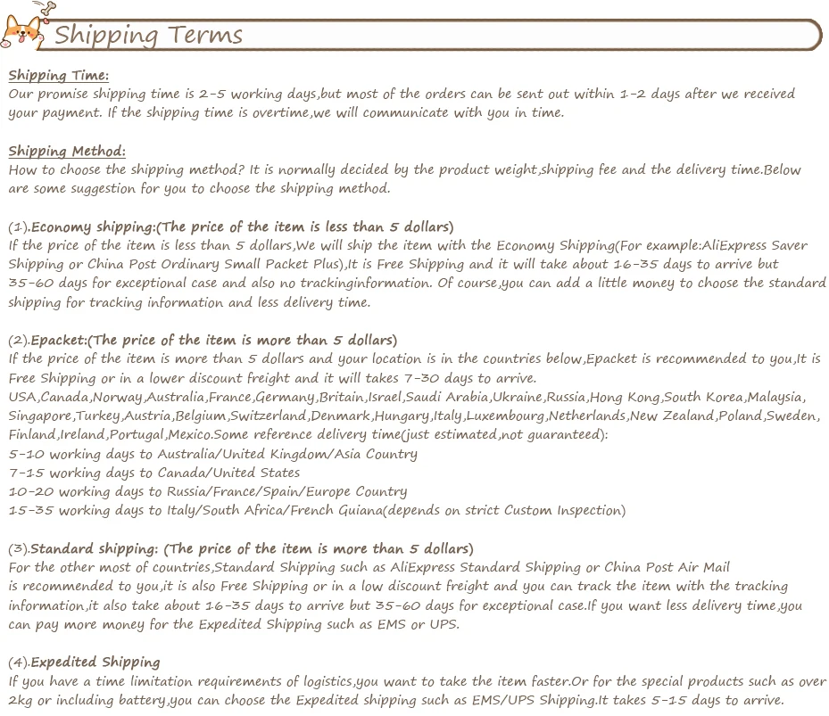 1. Если вы не можете проверить свою посылку, пожалуйста, сначала свяжитесь с нами, но не открывайте спор. Если ваш заказ превышает $5, мы отправим его стандартным способом доставки, и вы можете проверить его информацию об отслеживании.