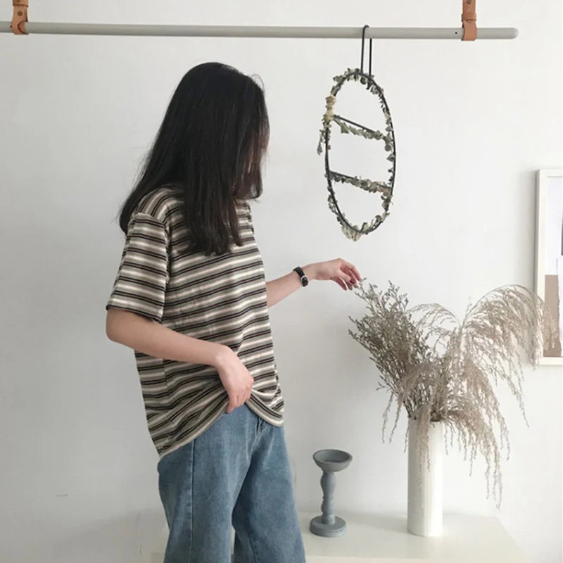 Футболка женская в полоску, винтажная Классическая рубашка в стиле Харадзюку, повседневный топ с коротким рукавом, лето