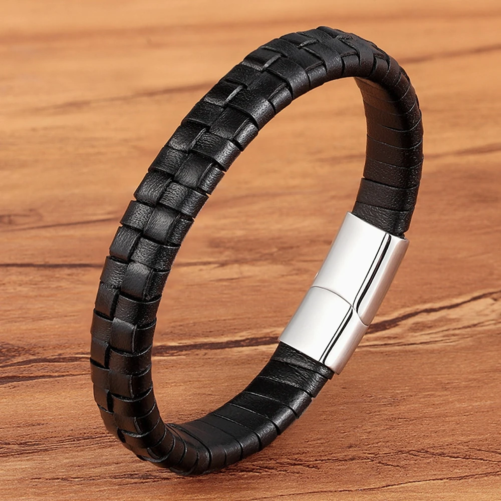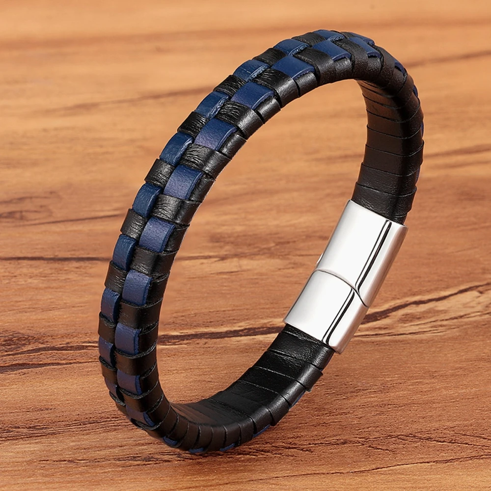 Магнитная застежка из полированной нержавеющей стали TYO, синийкоричневыйчерный плетеный кожаный браслет в клетку, мужские, унисекс, подарки дружбы