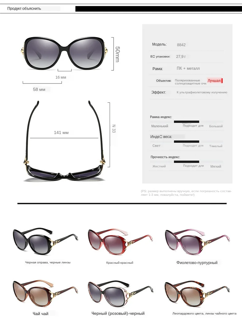 Солнцезащитные очки очень высокого качества! Они выглядят очень дорого, они очень удобные и очень хорошо упакованы! Очень впечатлен, обязательно порекомендовать этого продавца и его продукцию.