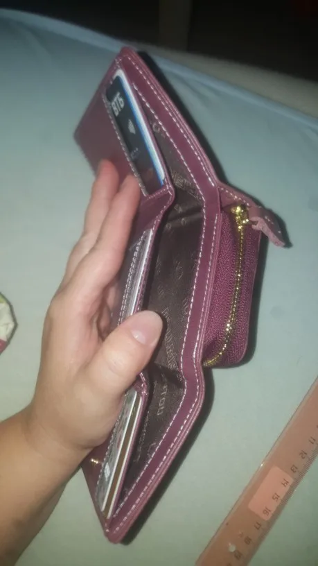 Товар соответствует описанию. Продавца рекомендую. Товар пришел быстро. Но для меня кошелёк оказался по вместимости меньше, чем я ожидала. Помещается 4 карты и немного купюр, отделение для мелочи вместительное.
