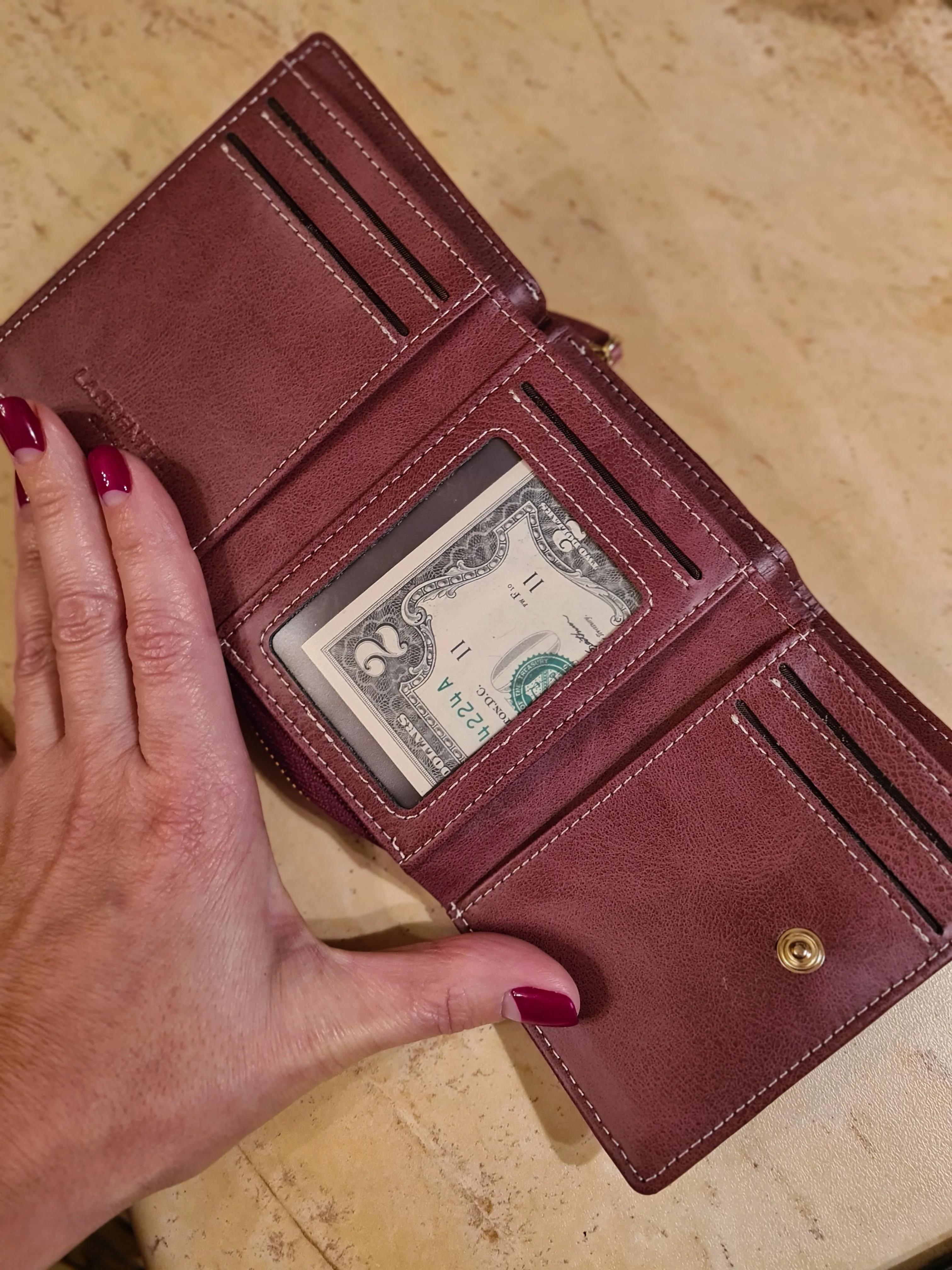 Симпатичный, качественный кошелек. Маленький, но так и было написано. Деньги влезают.