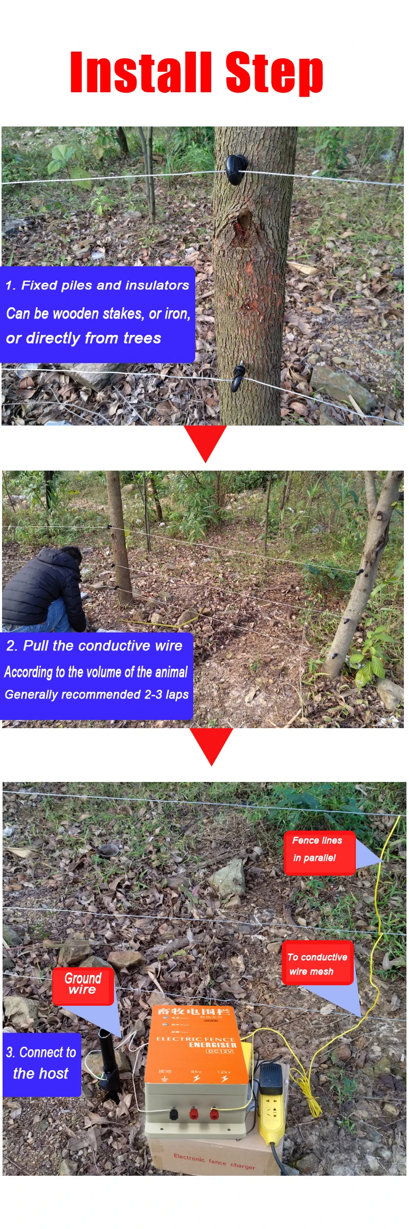 1. Электронный хост забора + деревянные кольи + изоляторы + проводящий металлический провод. Когда животное приближается, высоковольтный Пульс даст животному сильный высоковольтный Электрический шок.