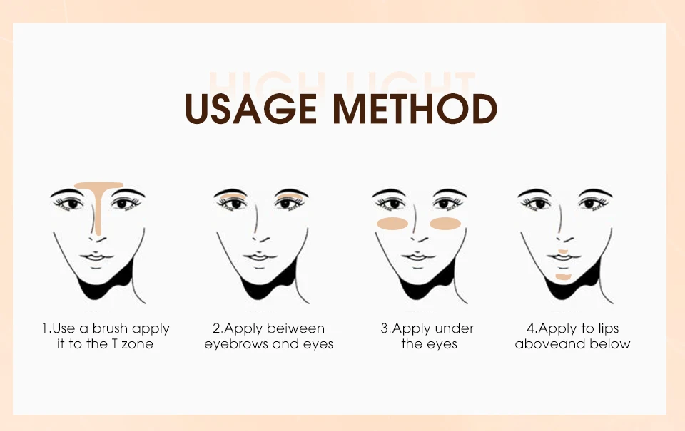 1. Нанесите кисть на Т-образную зону2. Нанесите брови и глаза beiween3. Нанесите под глазами4. Нанесите на губы сверху и снизу