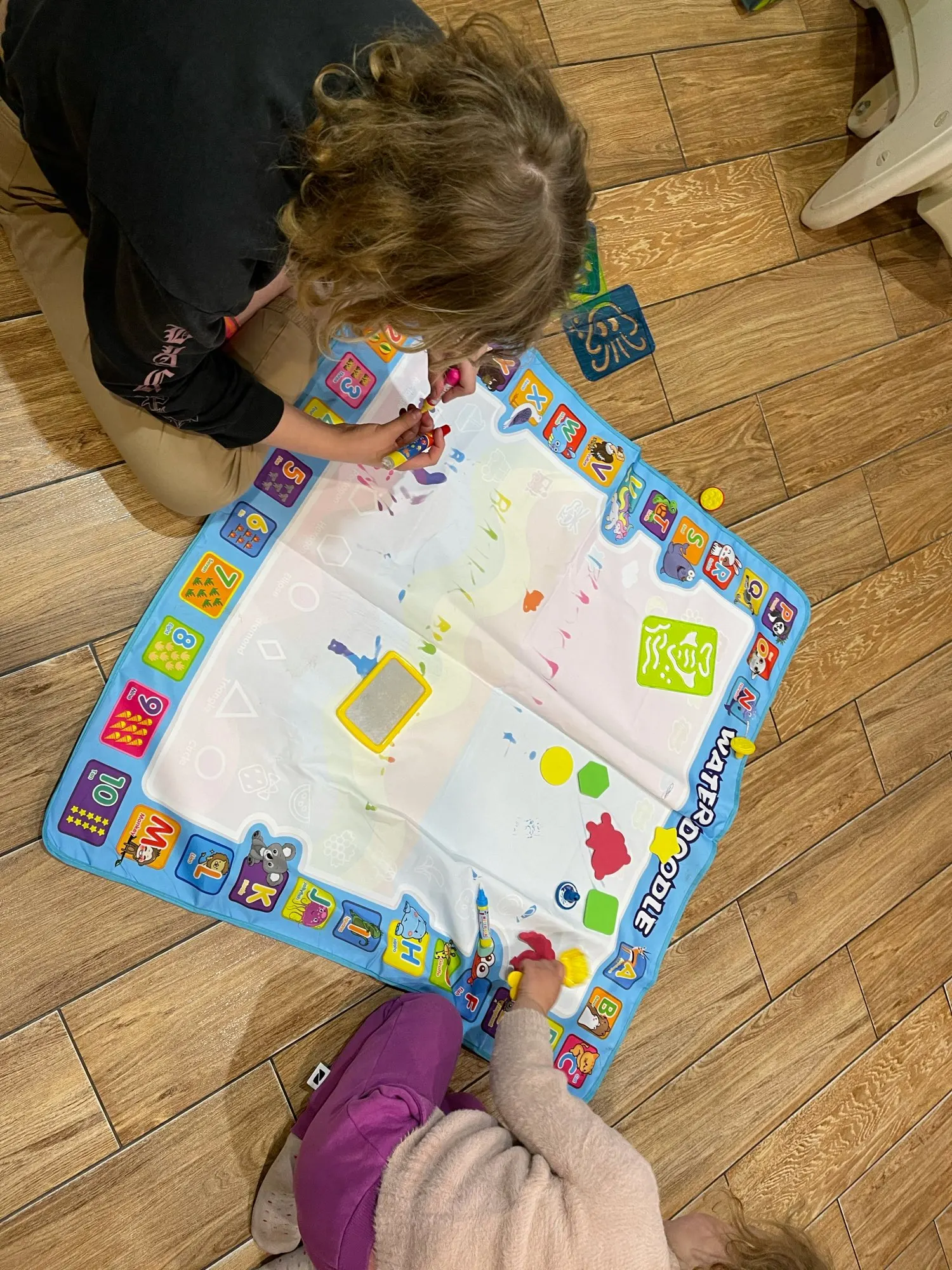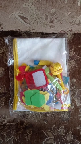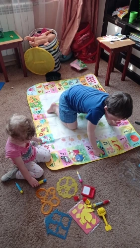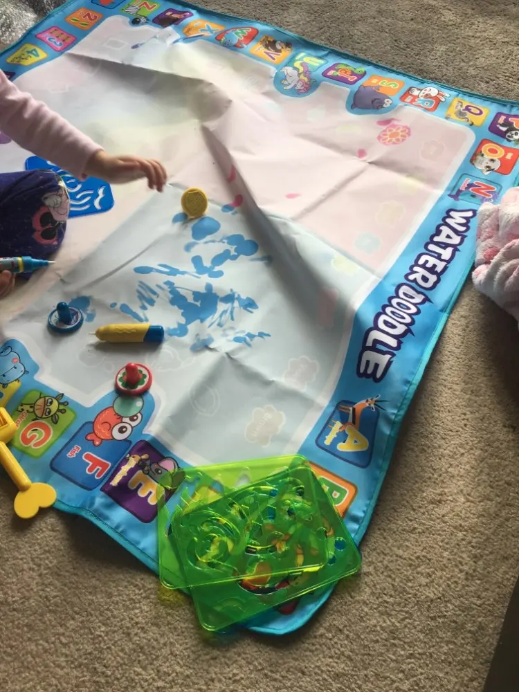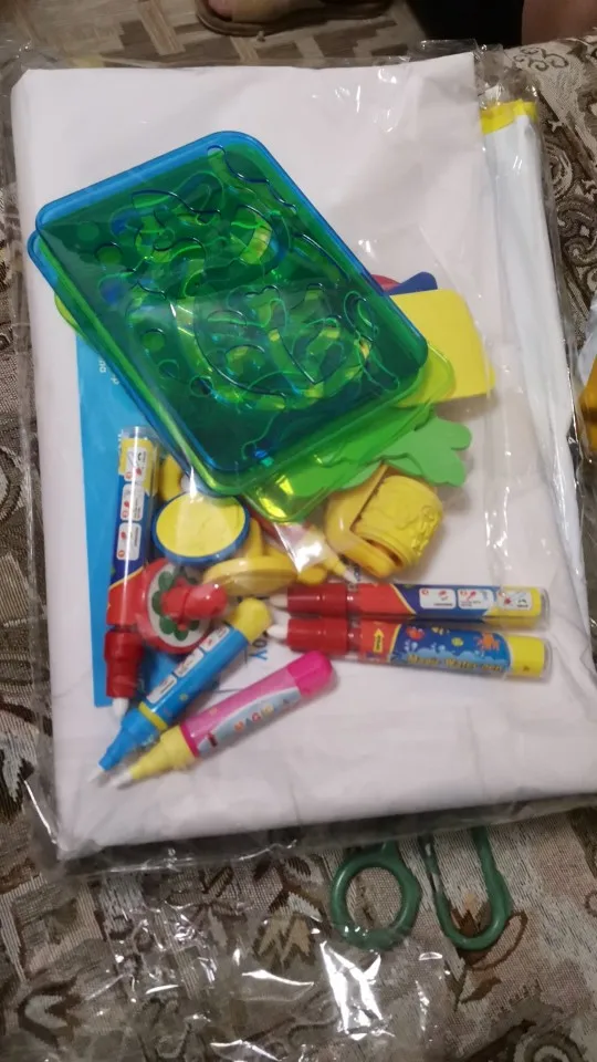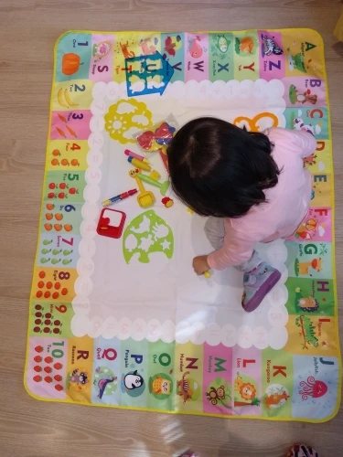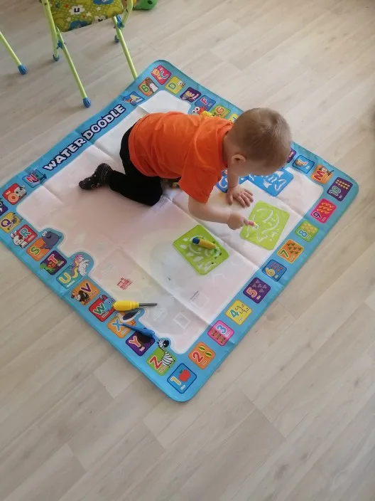Большое удовольствие! Очень много аксессуаров (маркеры воды, трафареты, трафареты, руководство, как нарисовать некоторые вещи). Коврик очень ярких цветов. Названия животных, owocow и растения на английском языке. Коврик быстро сохнет, juz через 10 минут вы можете повторно использовать.