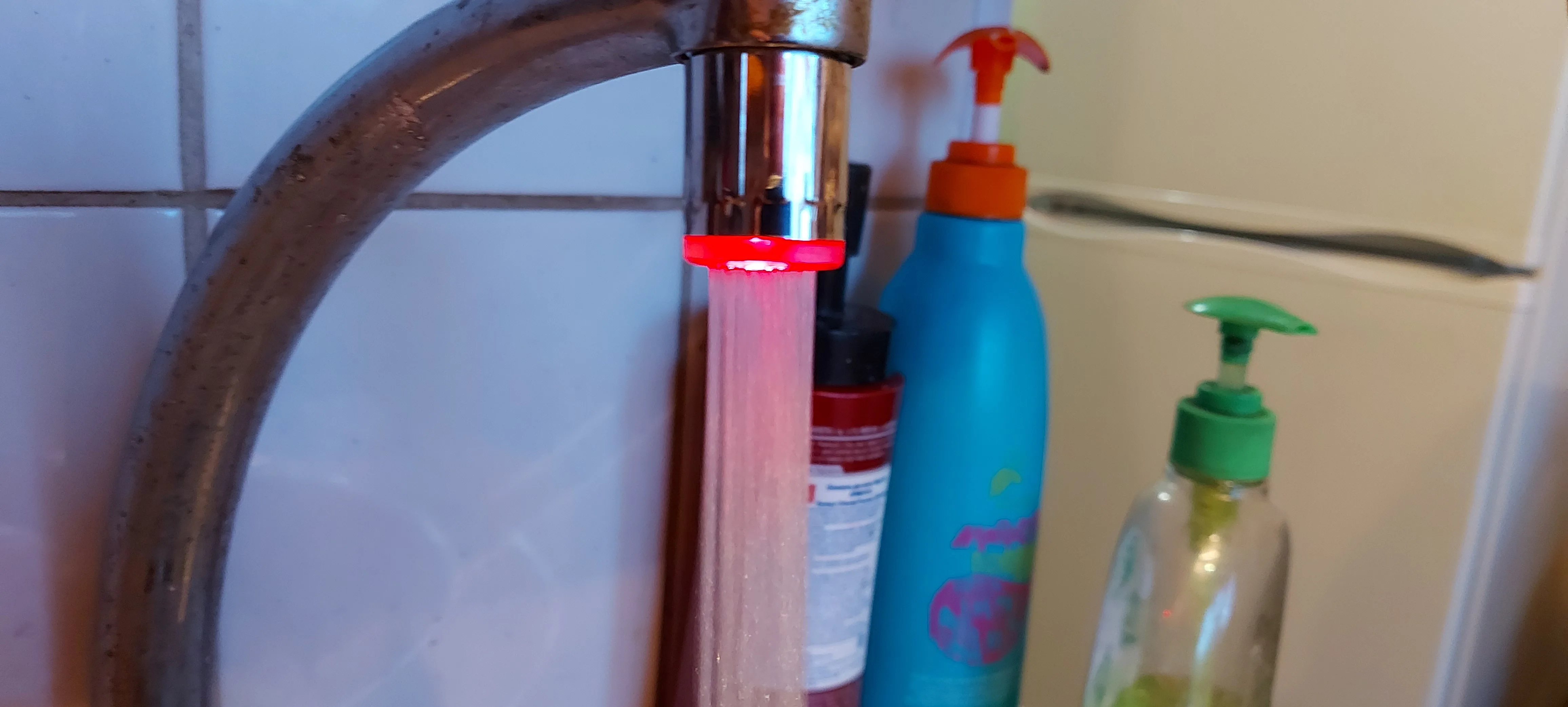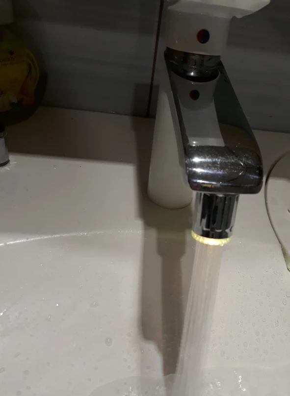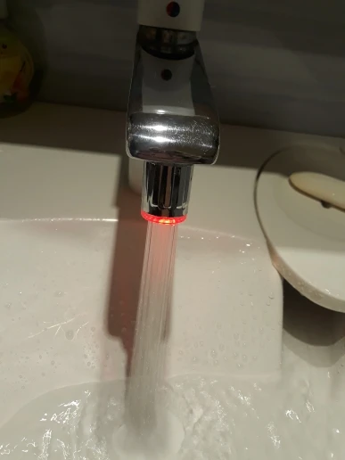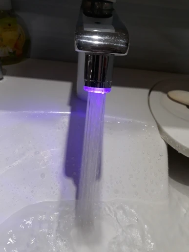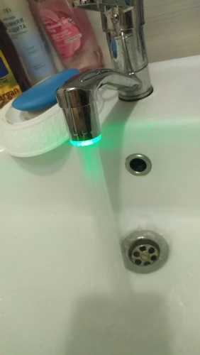 Думала , что на горячие и холодное реагирует , но нет - просто мигает разными цветами и гудит когда напор воды больше делаешь . В целом интересная штучка ))))